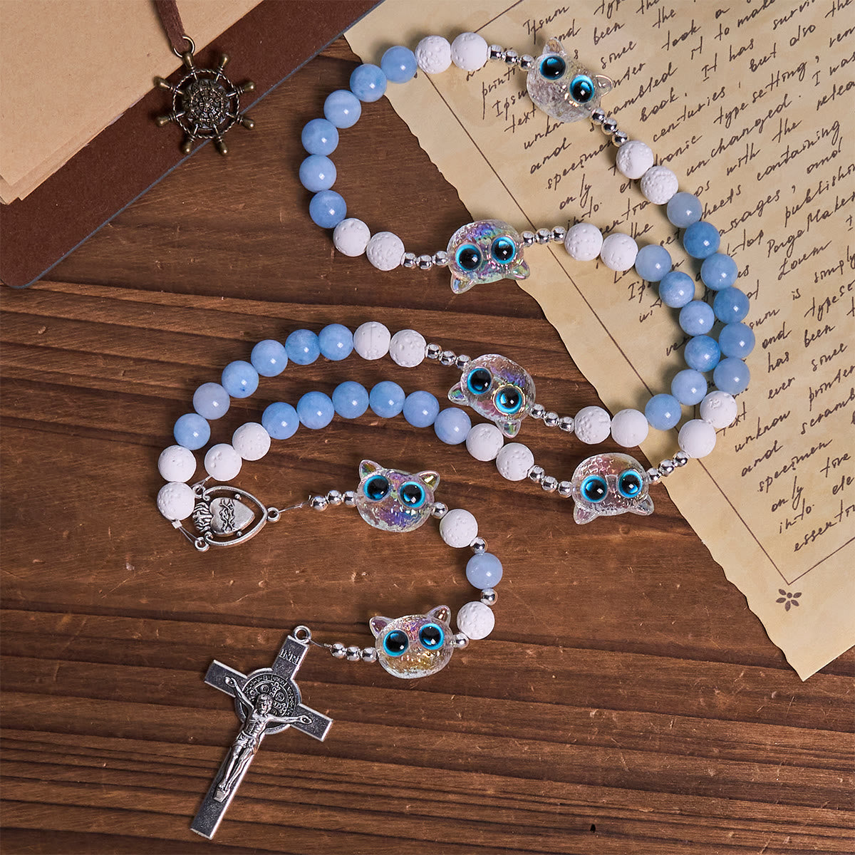 Christianartworkshop Benedizione del gatto in vetro con rosario commemorativo in pietra lavica bianca e acquamarina