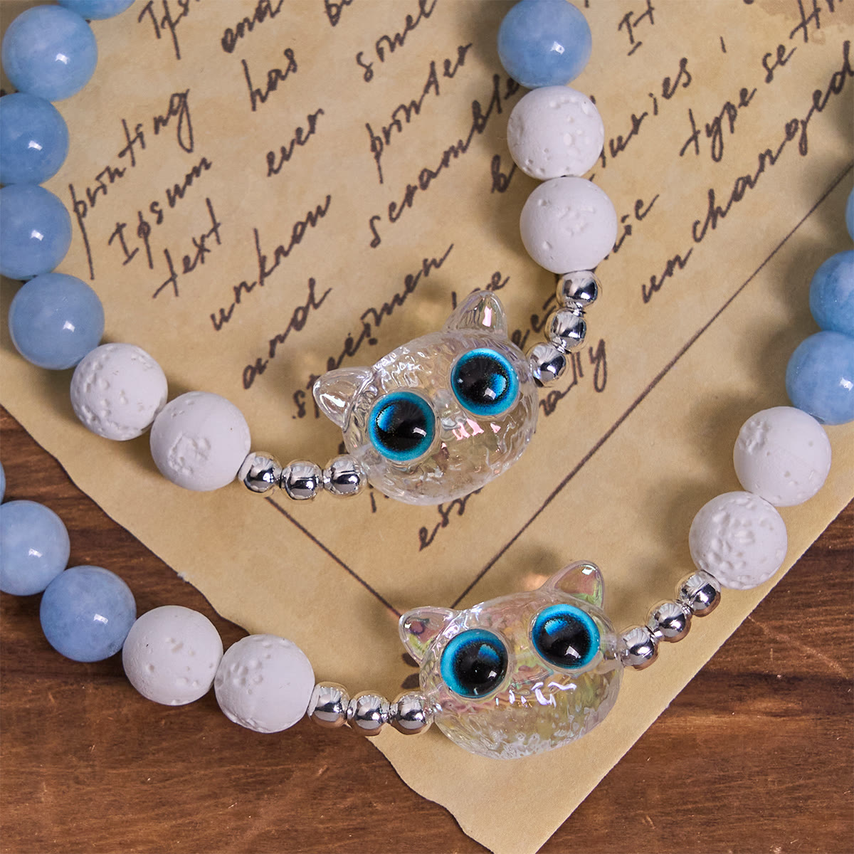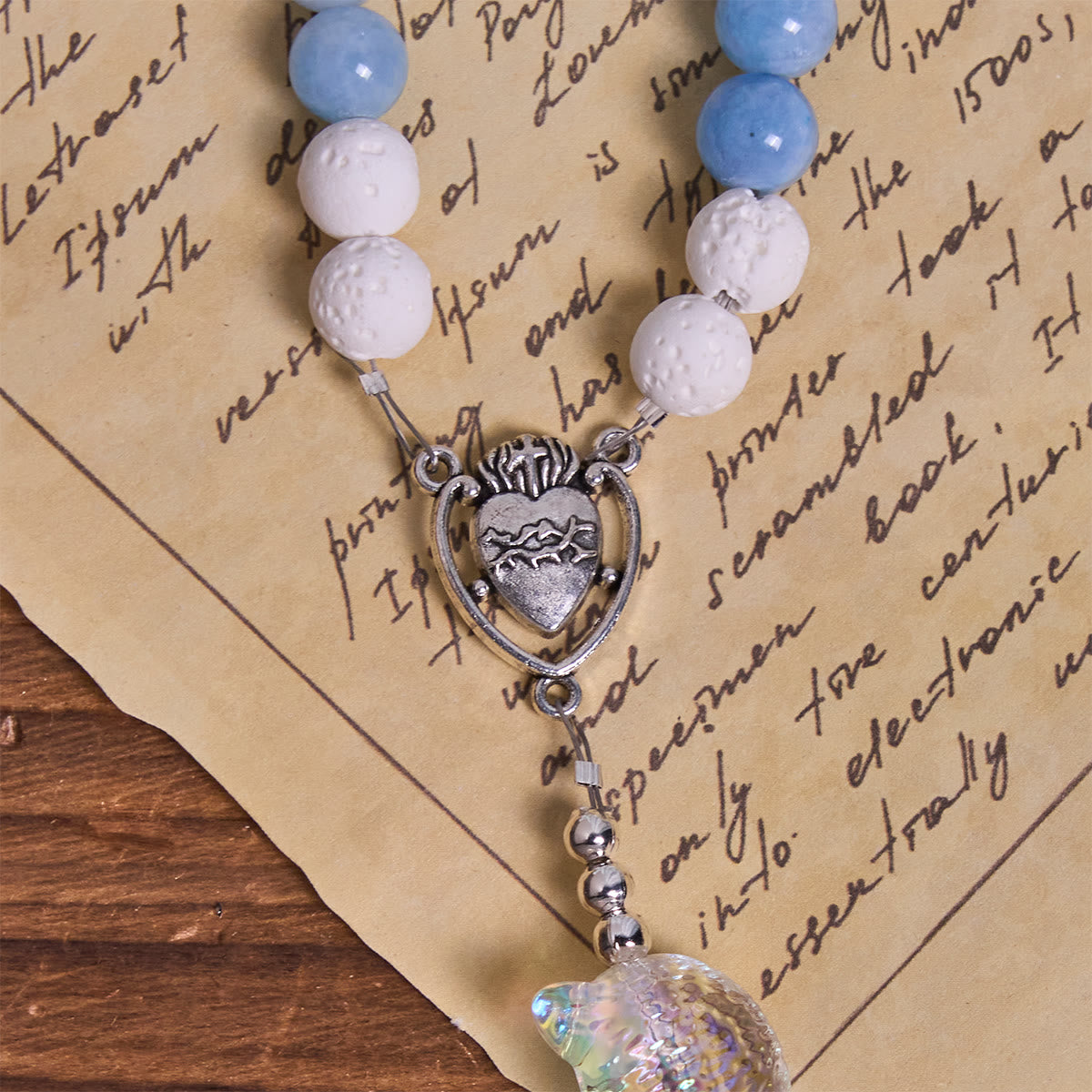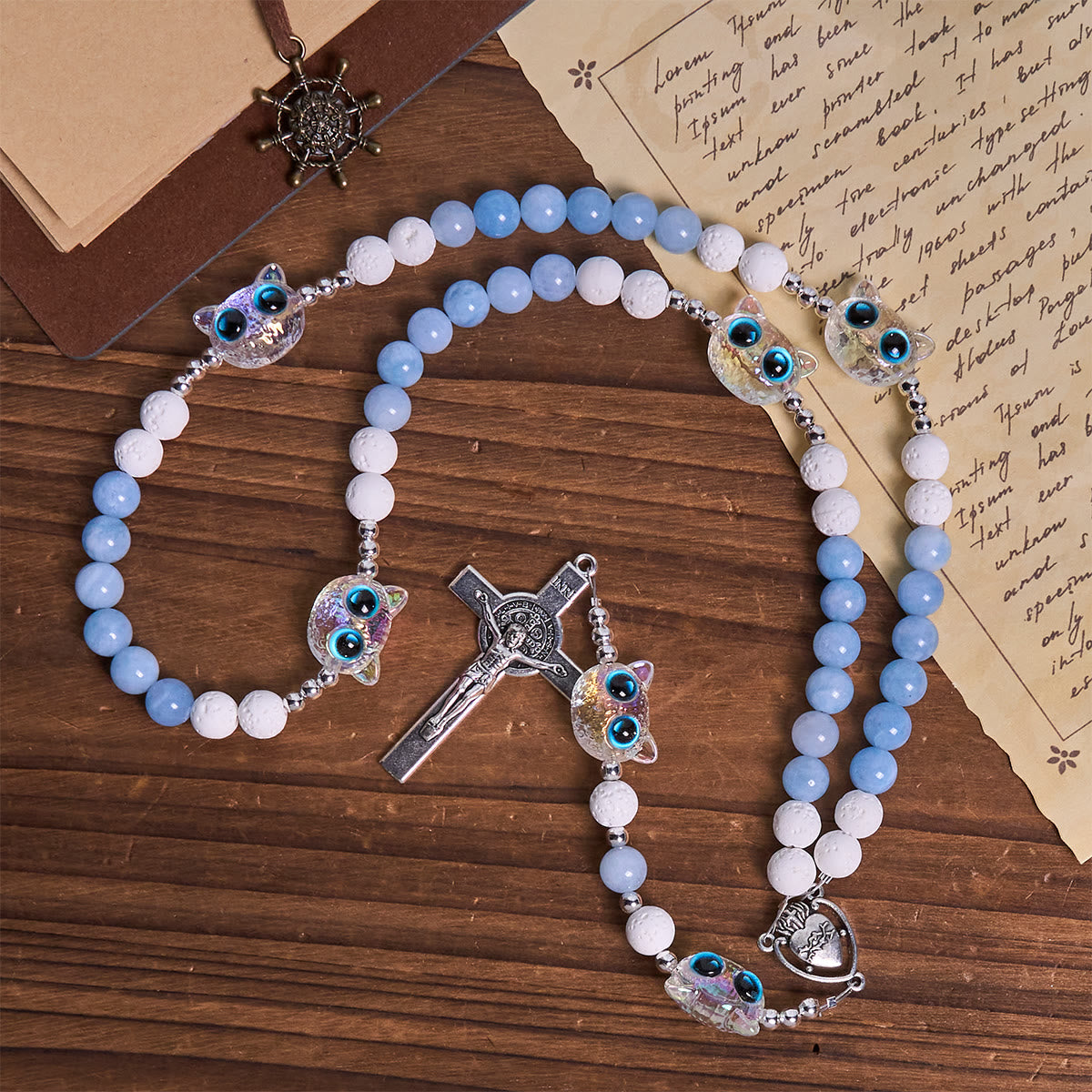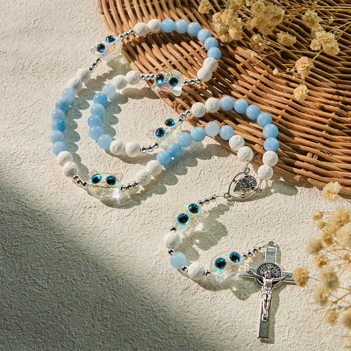 Le delicate perle blu e bianche evocano la pace del Paradiso, mentre i luccicanti dettagli a forma di gattino simboleggiano l'innocenza e la bellezza della creazione di Dio, riecheggiando la verità che ogni vita è preziosa ai Suoi occhi.