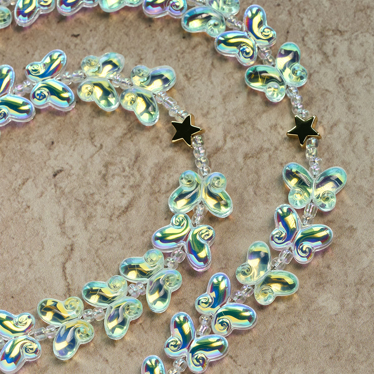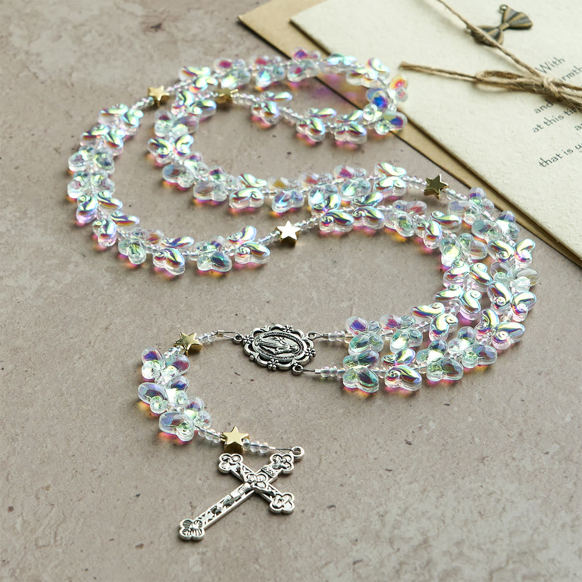 Questo rosario da cinque decine è composto da perline a forma di farfalla verde scintillante con decorazioni a stella, una medaglia miracolosa al centro e un crocifisso decorato: leggero come il cielo notturno, ideale per una devozione gioiosa.