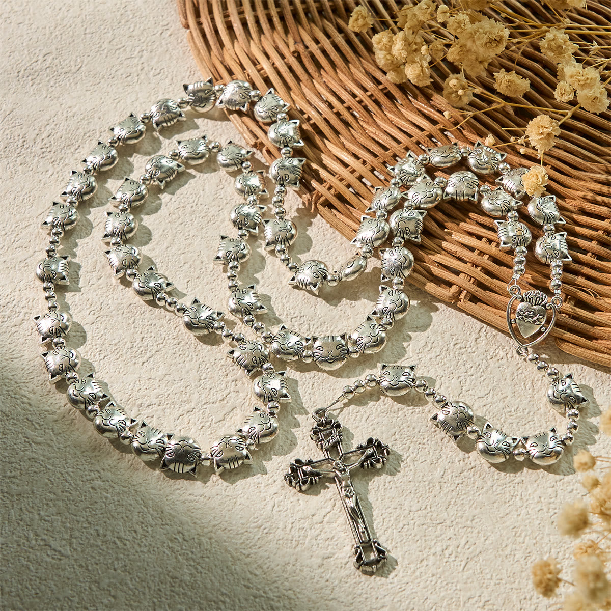 Questo rosario particolare unisce la tenera immagine del Sacro Cuore di Gesù a una deliziosa serie di grani a forma di muso di gatto, creando un sentito promemoria che l'amore e la misericordia del Signore si estendono a tutta la Sua creazione: ogni persona, ogni creatura, ogni vita. - Sacro Cuore – Simbolo di Amore Infinito