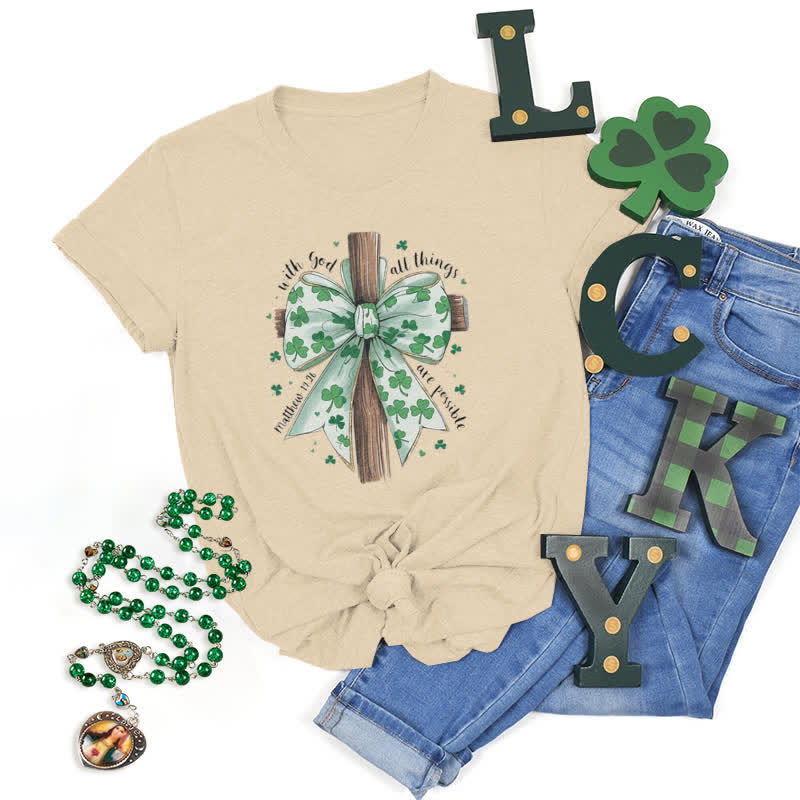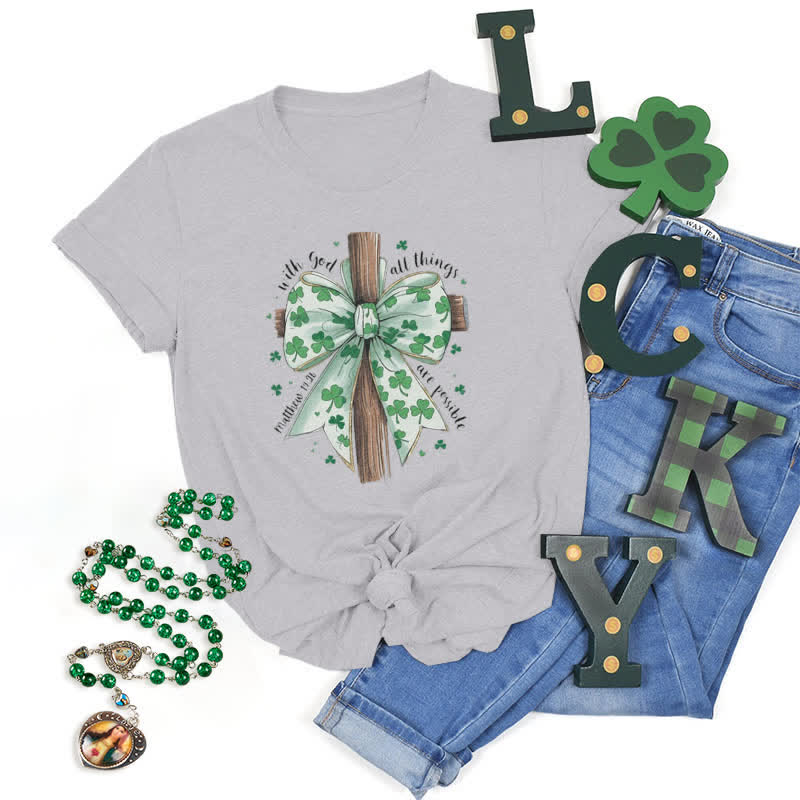 Celebra la magia di San Patrizio con la nostra incantevole t-shirt "Con Dio, tutto è possibile". Questo capo intreccia splendidamente l'essenza della festa con un profondo messaggio di fede e speranza. Caratterizzata da una delicata croce ornata da un fiocco con motivo a trifoglio, rende omaggio alla ricca tradizione di San Patrizio, simbolo di fortuna, fede e benedizioni. Il versetto ispiratore di Matteo 19:26 ci ricorda con dolcezza che con la grazia di Dio, ogni possibilità è a portata di mano. Indossa questa maglietta come simbolo di benedizioni divine e lascia che riempia la tua giornata con il vero spirito di San Patrizio: gioia, fede e un tocco di magia.