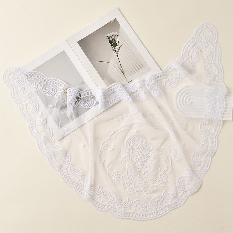 Christianartworkshop Velo da cappella in pizzo bianco e nero con ricamo della Vergine Maria e di Gerusalemme