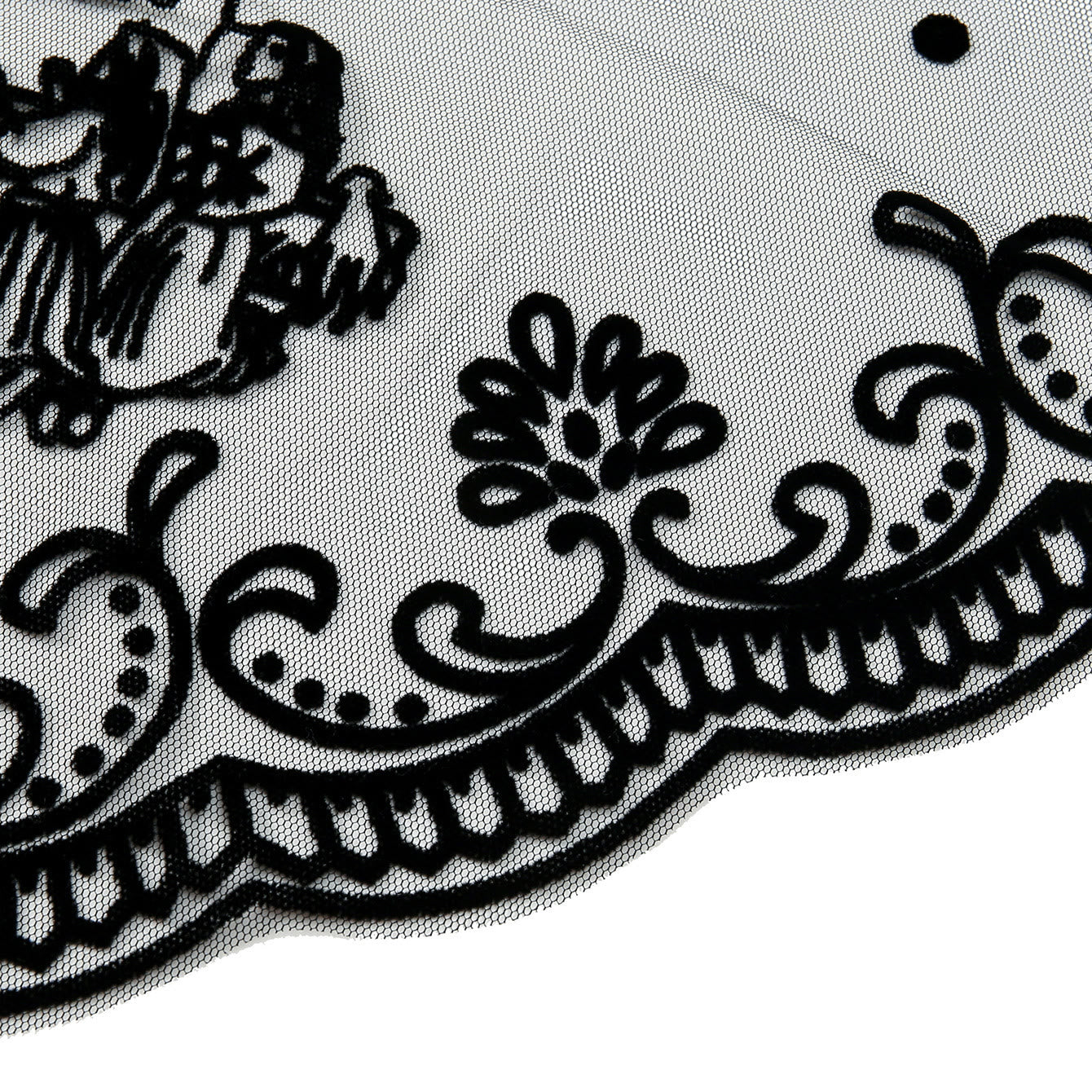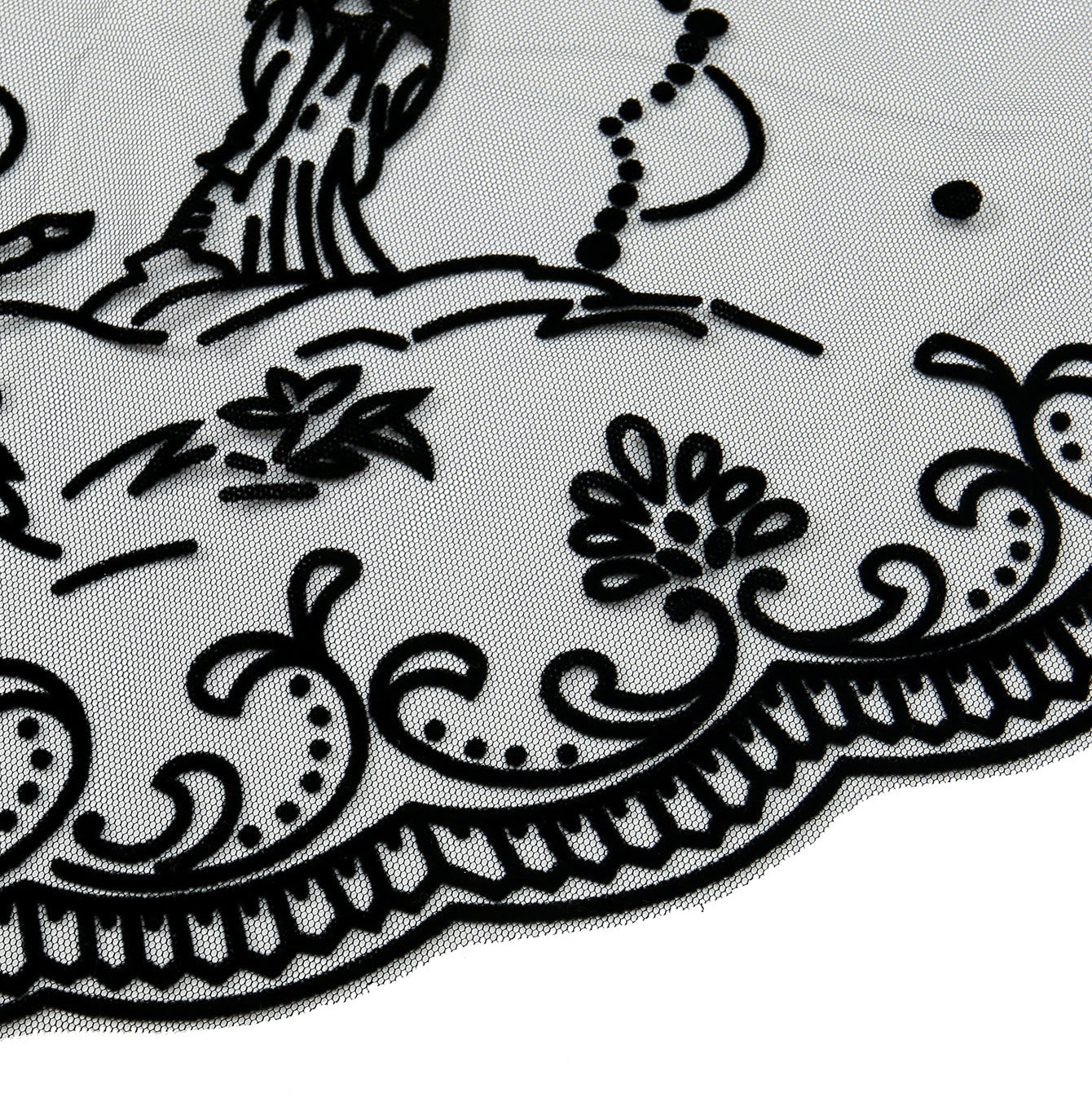 L'elaborato pizzo nero avvolge il velo con morbida eleganza, mentre i suoi vorticosi motivi floreali intessono riverenza in ogni piega. - Devozione silenziosa, copertura aggraziata