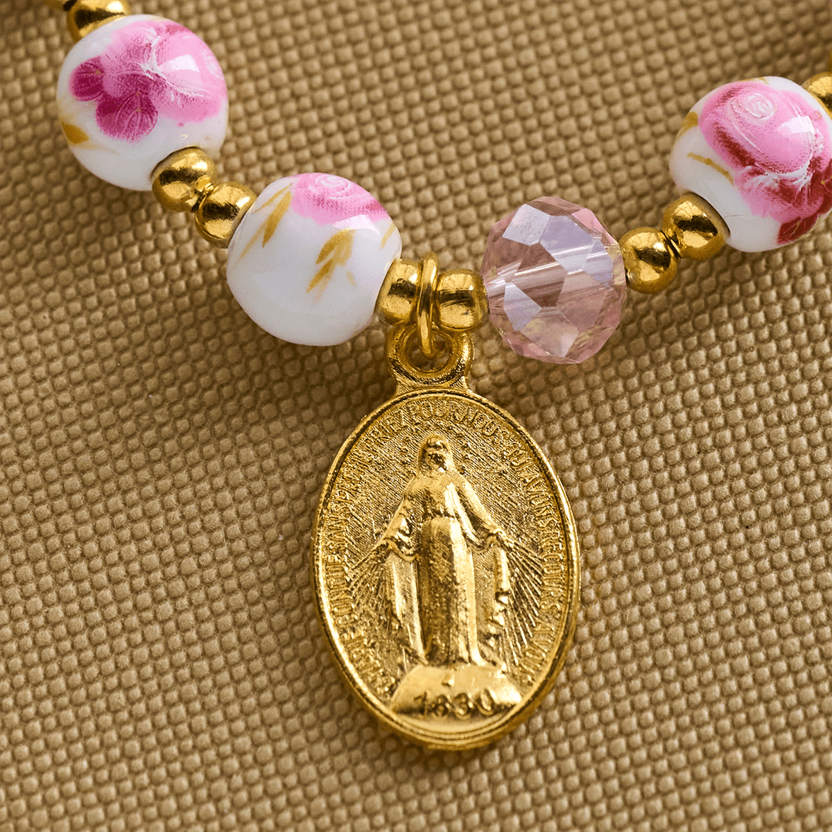 Christianartworkshop Elegante bracciale in ceramica rosa con motivo floreale da 8 mm e medaglia miracolosa