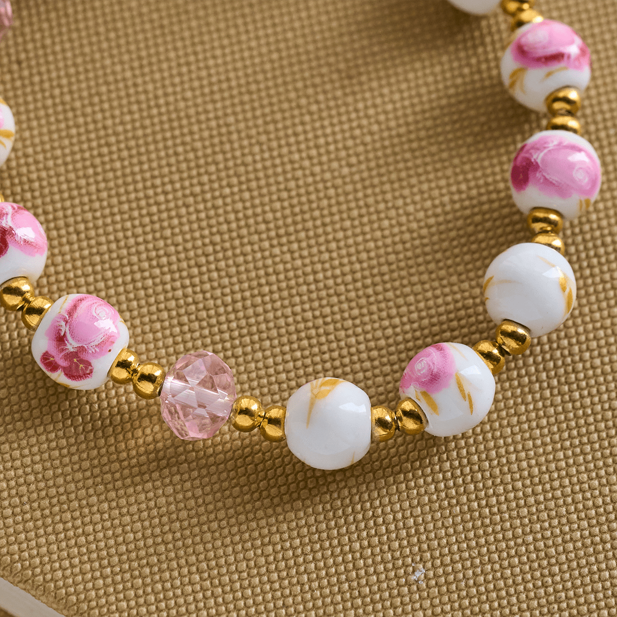 Porta serenità e concentrazione spirituale nella tua vita quotidiana con questo elegante bracciale in ceramica rosa, con perle da 8 mm decorate con delicati motivi floreali. Le sue tonalità morbide e armoniose ispirano calma e riflessione, offrendo un delicato ma splendido ricordo della presenza di Dio.