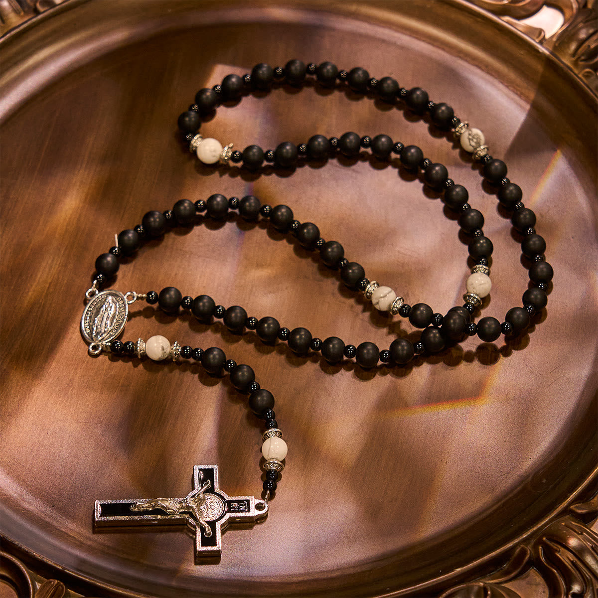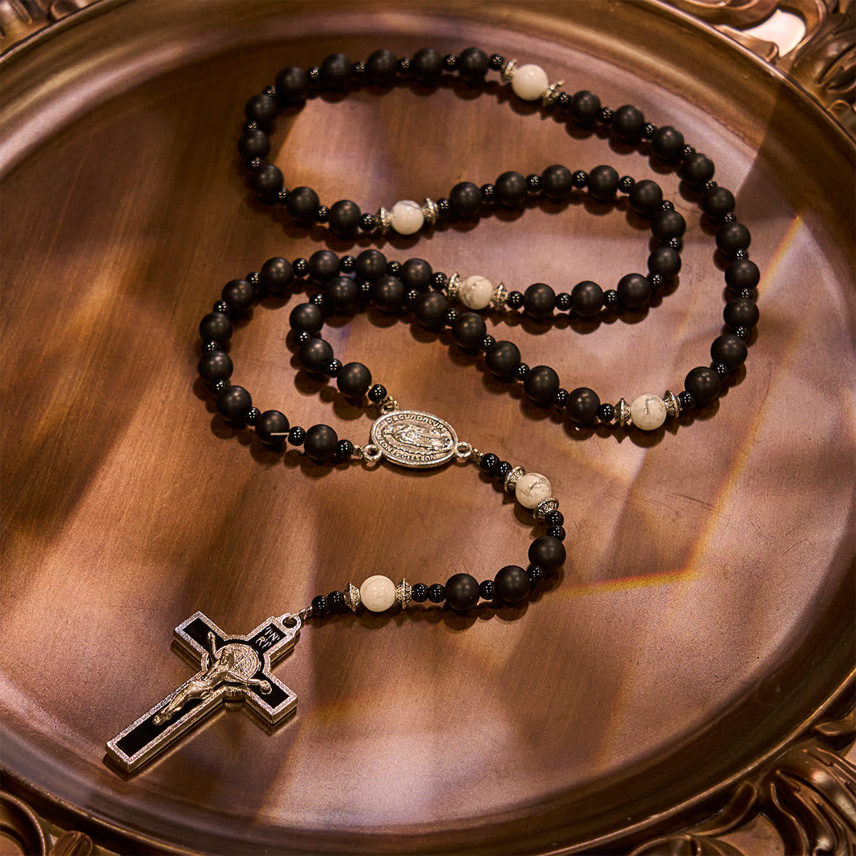 Decorato con perle lisce nere opache e pietre chiare intervallate, ogni perla è tattile e significativa. Il crocifisso in argento e la medaglia religiosa aggiungono un tocco di riverenza, esaltando il ruolo del rosario come guida alla preghiera.