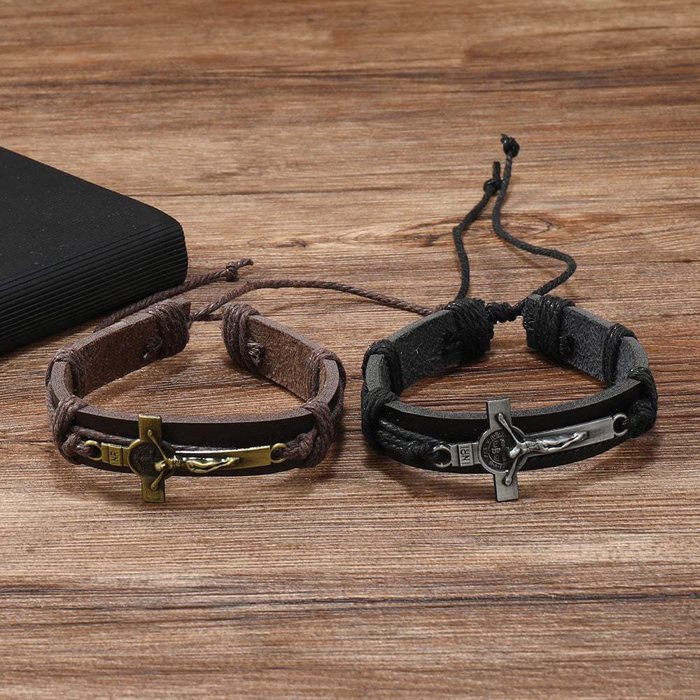 Bracciale regolabile in pelle marrone o nera in stile classico con crocifisso