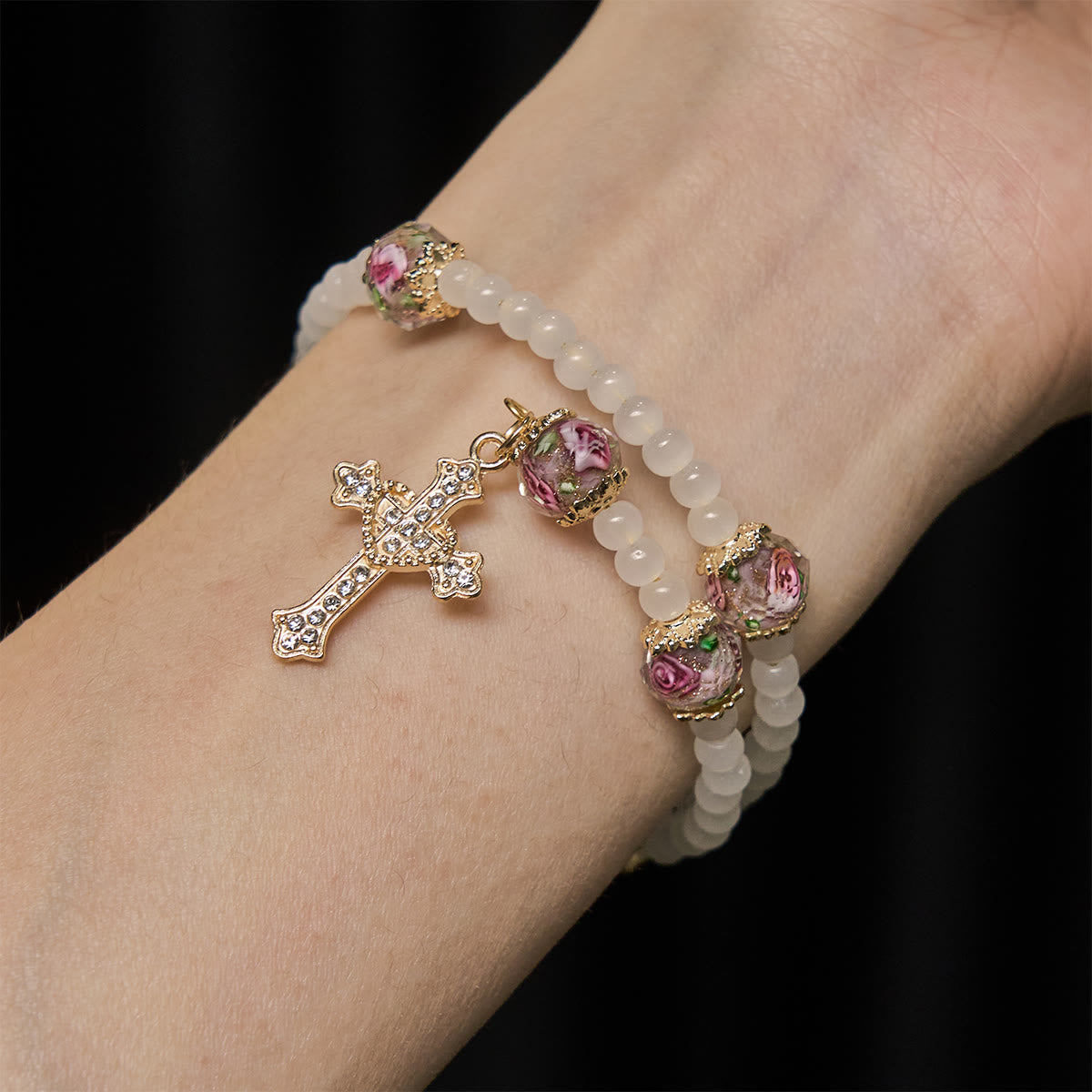 Questo bracciale rosario in filo di ferro battuto unisce delicate perle floreali a una croce scintillante (simbolo fondamentale della fede), creando un tenero legame con la grazia spirituale. I motivi a rosa (simbolo dell'amore divino) avvolgono ogni bracciale in una silenziosa riverenza.
