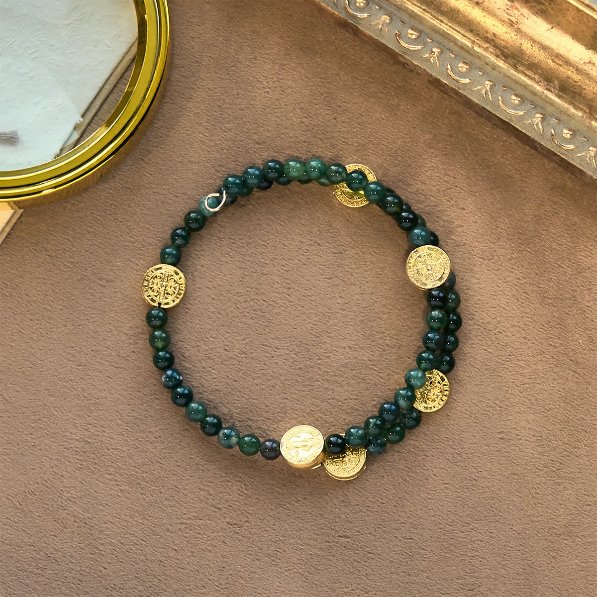 Questo bracciale rosario in filo di agata Water Grass fonde la bellezza della natura con simboli sacri (gli accenti della medaglia). La delicata lucentezza dell'agata incontra motivi spirituali, creando un accessorio unico e incentrato sulla fede. - Realizzato con grazia naturale