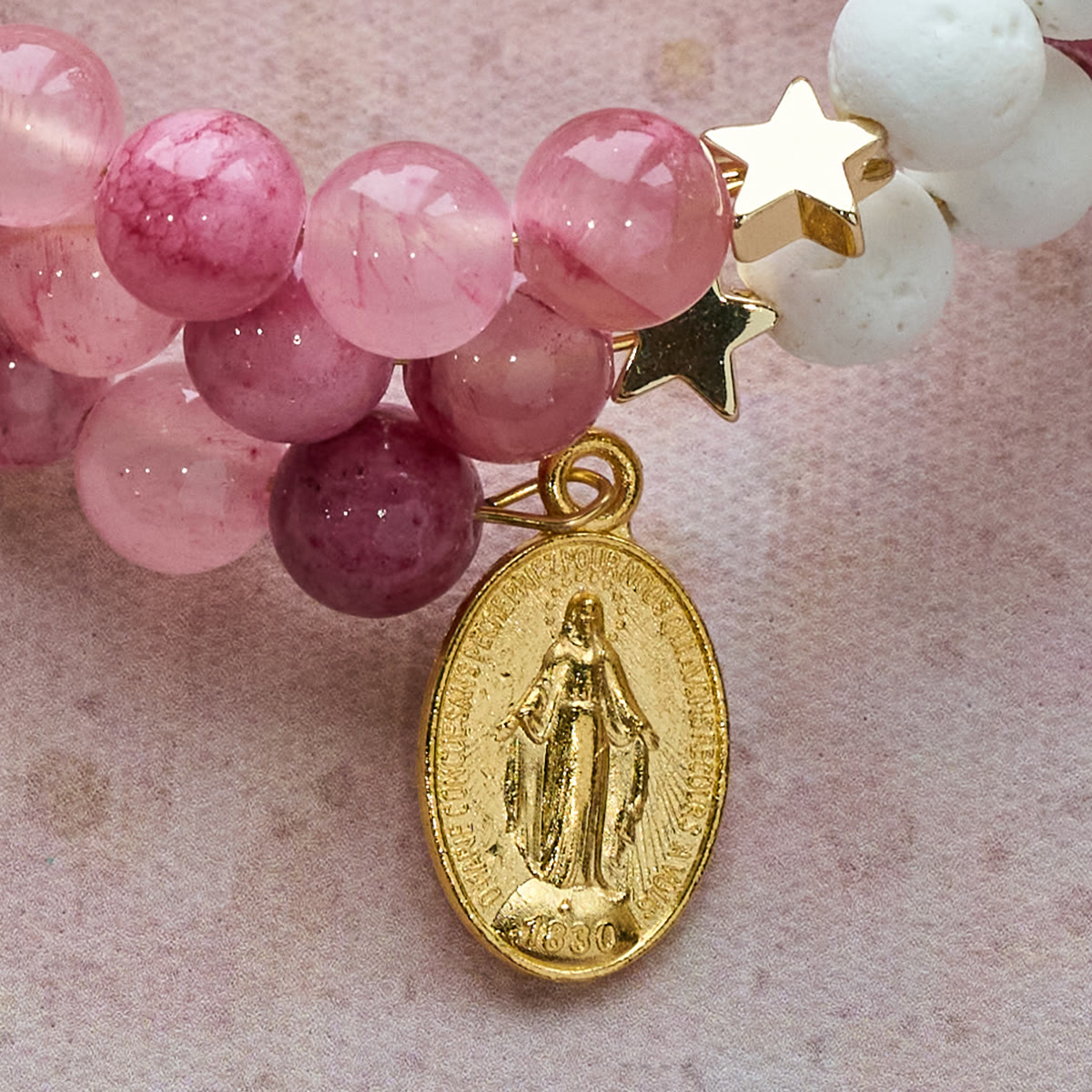 La miscela di toni di gesso e agata rosso rosa incarna l'armonia di purezza e devozione: l'agata rosso rosa simboleggia l'amore e la connessione divina, mentre il gesso rappresenta la tranquillità e la chiarezza spirituale. La loro interazione rispecchia il cammino di fede: duraturo, sentito e permeato dalla presenza divina. - Un dono di devozione e grazia indossabile