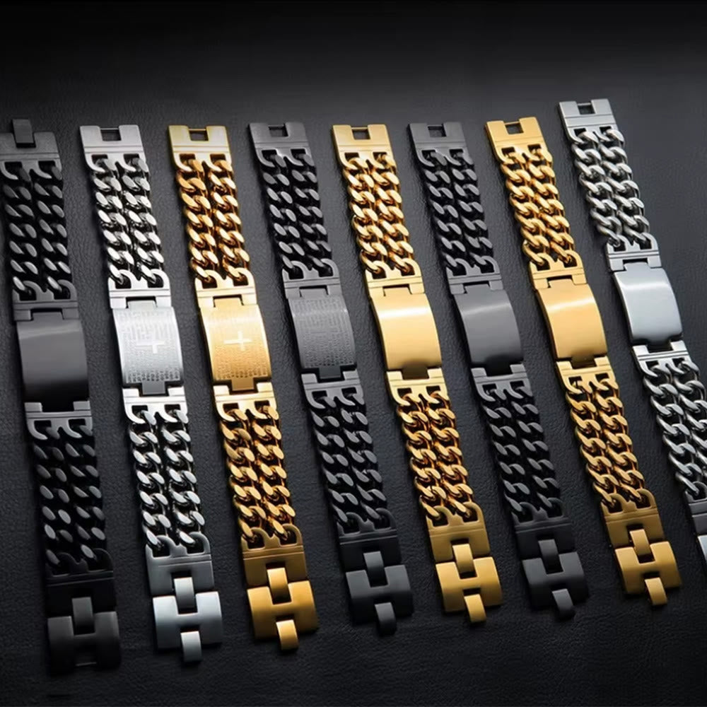 Realizzato con maestria in metallo resistente, presenta intricate incisioni con testi sacri e un audace design a catena. Costruito per durare, mantiene un look significativo e duraturo, perfetto per l'uso quotidiano.