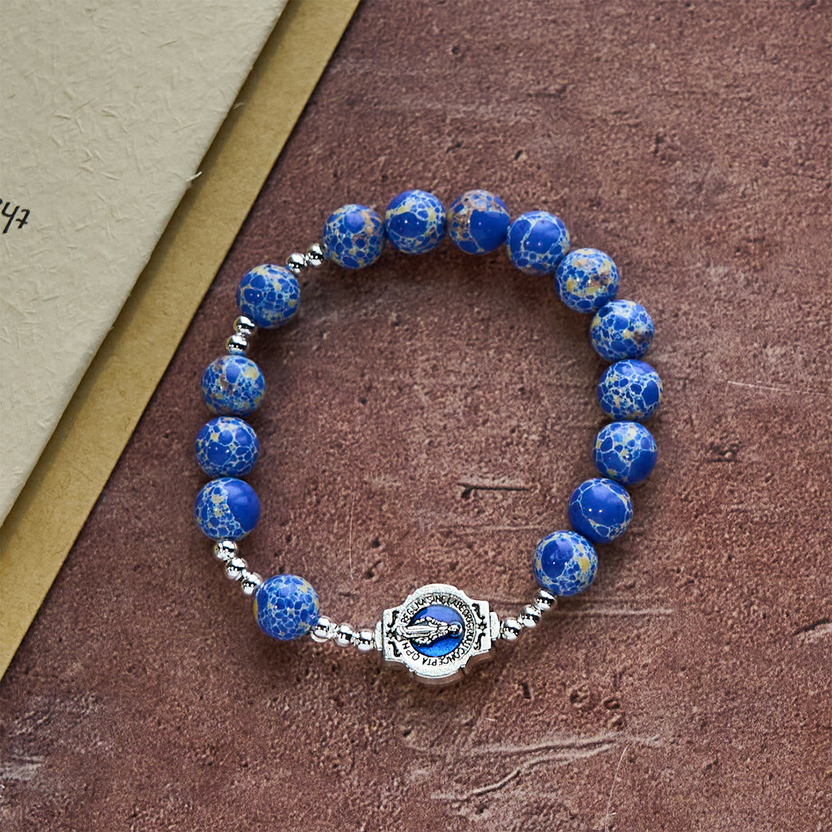 Dalle proporzioni eleganti, perfetto per l'uso quotidiano, questo bracciale coniuga semplicità e sacralità. Le sue rilassanti tonalità blu incoraggiano la calma della preghiera, rendendolo un sottile ma potente promemoria della forza silenziosa della fede. - Un dono significativo di grazia