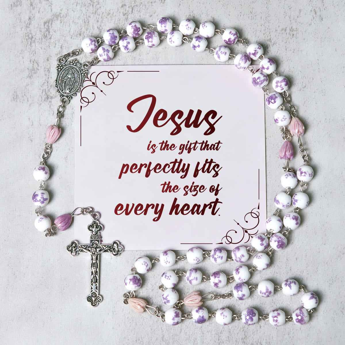 Il rosario presenta grani in ceramica, ciascuno decorato con intricati motivi floreali viola. Mentre si fanno scorrere le dita su questi grani lisci durante la preghiera, il loro fascino tattile offre un'esperienza rilassante e immersiva. Il materiale ceramico, con la sua delicata lavorazione, aggiunge un tocco di eleganza e atemporalità al vostro atto di adorazione. - Accenti lilla tenui