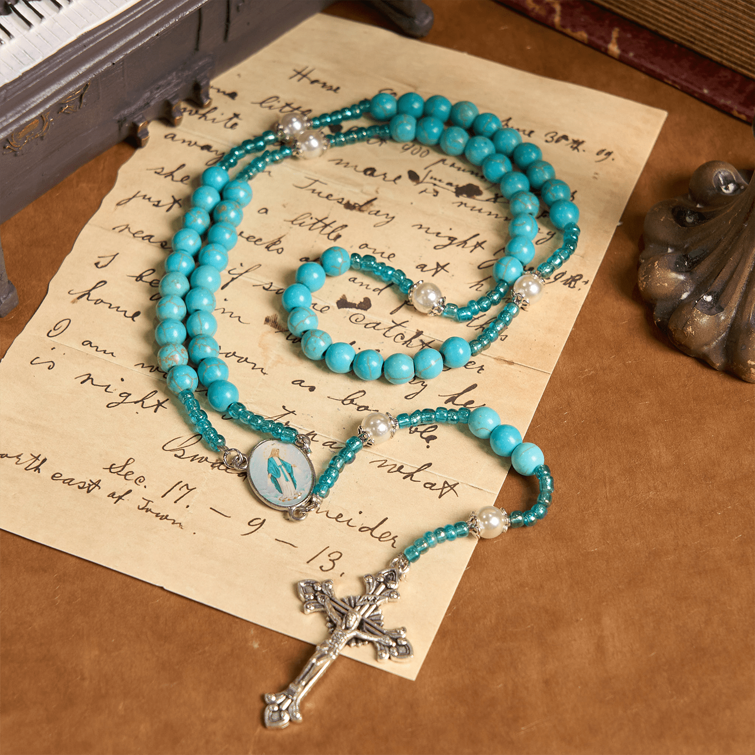 Il Rosario è composto principalmente da grani turchesi. Il suo colore unico ricorda l'acqua limpida di un lago, emanando un'atmosfera misteriosa e affascinante, simbolo di tranquillità e speranza. Ogni grano è stato accuratamente selezionato e la sua consistenza calda e unica offre una doppia esperienza visiva e tattile per la meditazione e la preghiera, trasmettendo pace mentale e perseveranza nella fede.