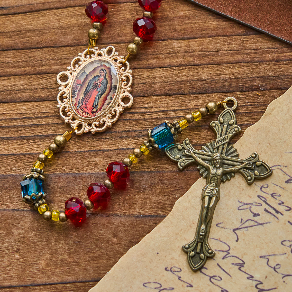 Christianartworkshop Rosario crocifisso della Madonna di Guadalupe in cristallo rosso fatto a mano in vetro ceco di Boemia