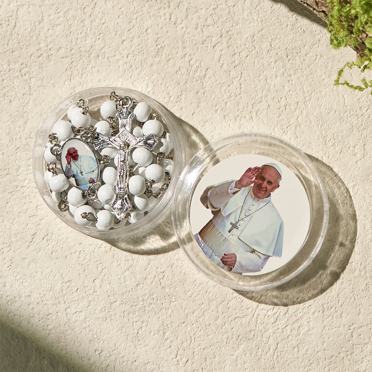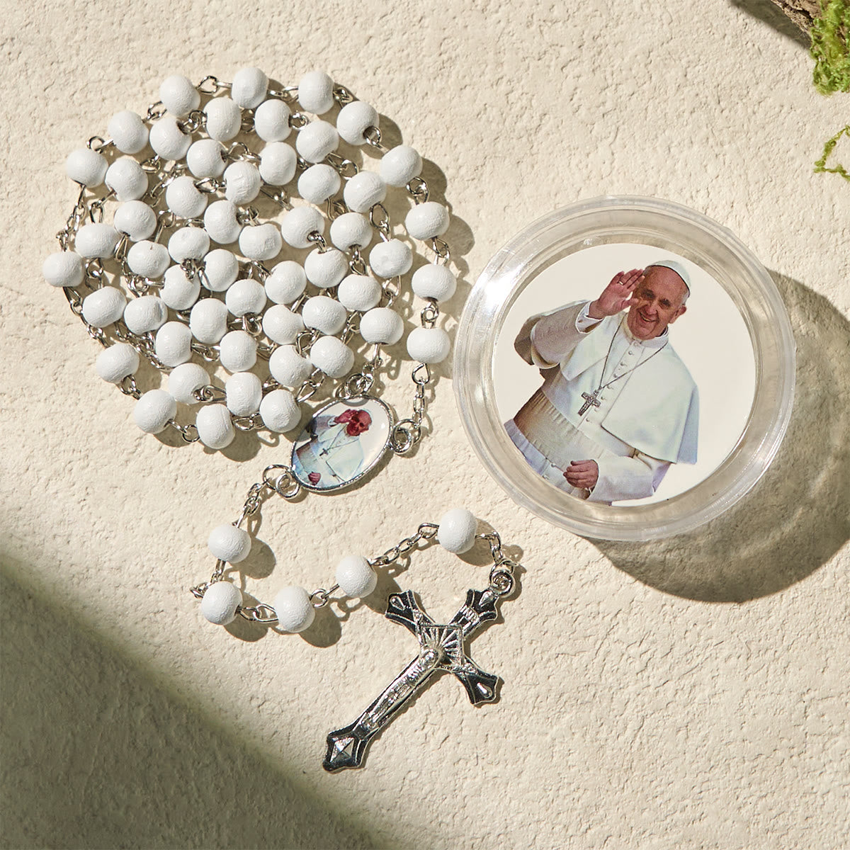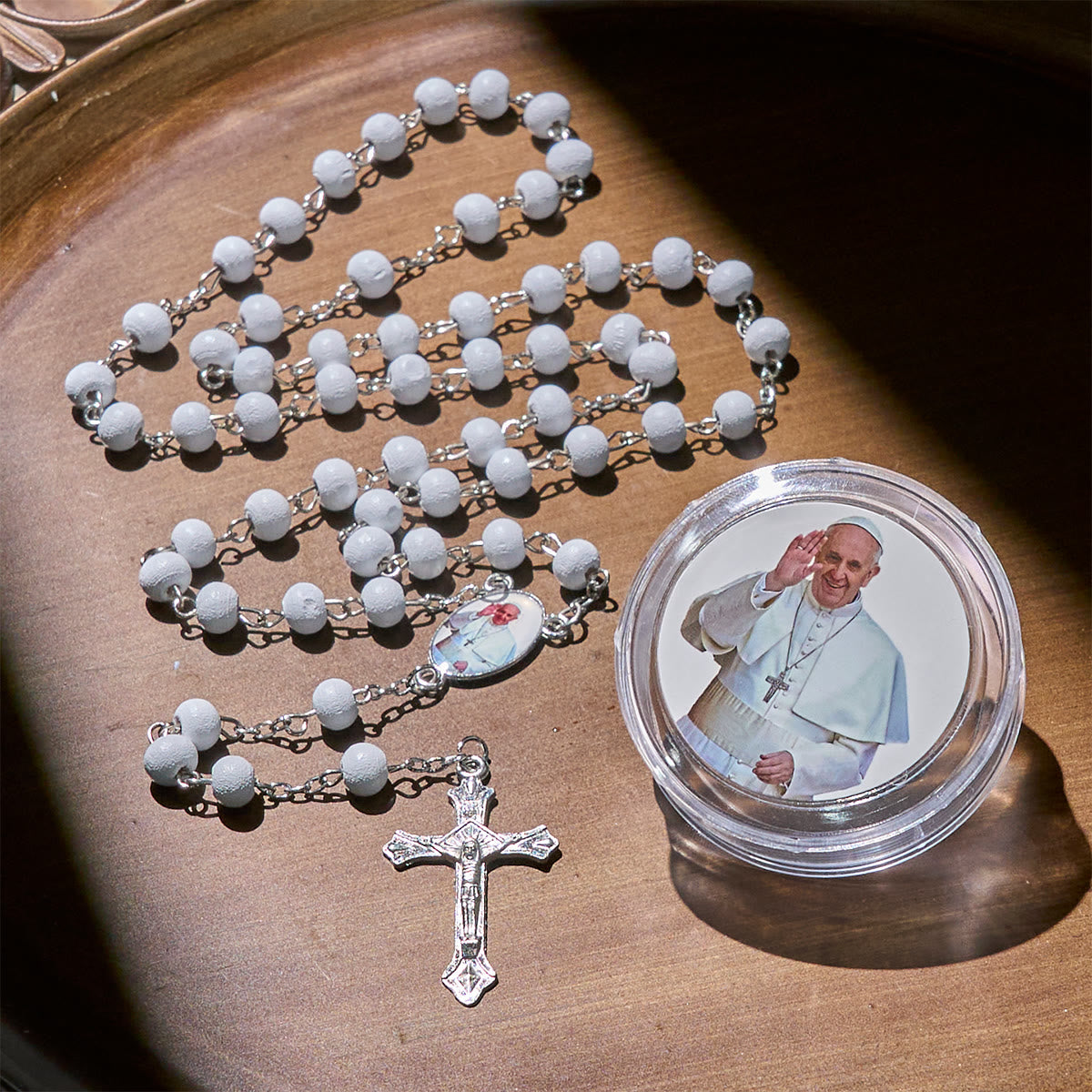 Al centro di questo rosario c'è un medaglione raffigurante Papa Francesco, simbolo di umiltà, compassione e benedizione divina, abbinato a un sacro crocifisso che rappresenta la fede e la redenzione. - Caso speciale di Papa Francesco incluso