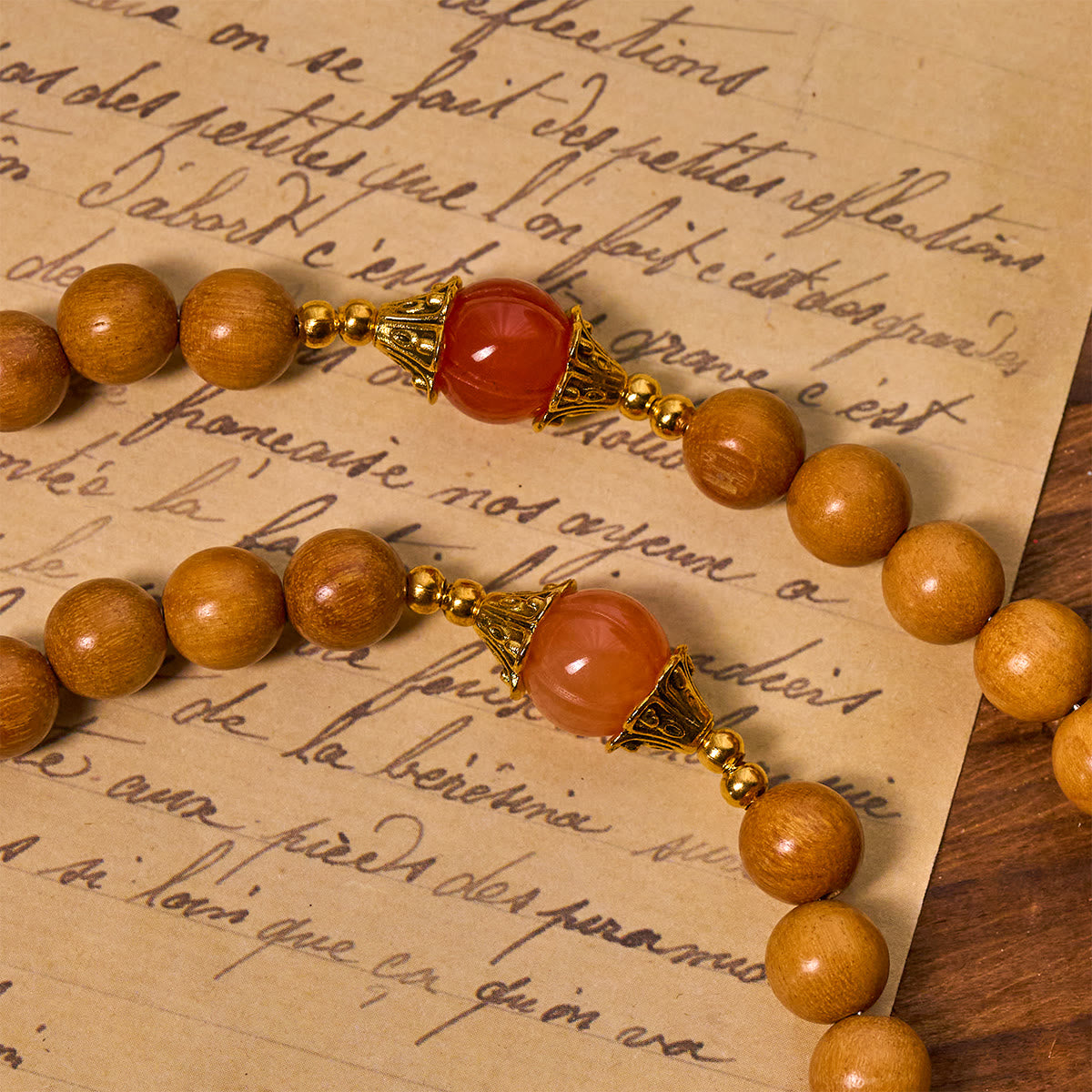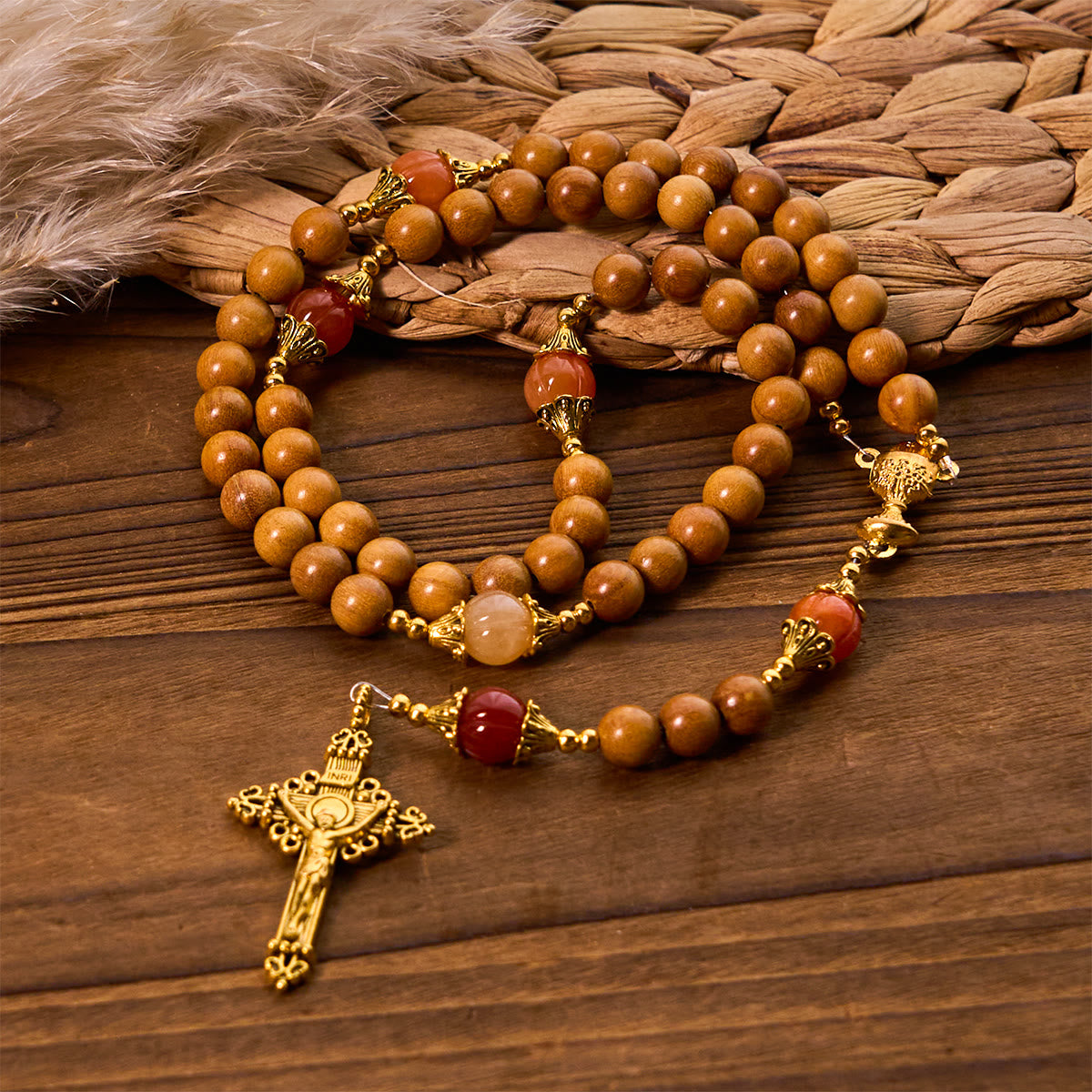 Rosario di sandalo per la devozione del Ringraziamento Christianartworkshop con gemme di zucca Golden Grace e Santo Graal - Legna - image 0