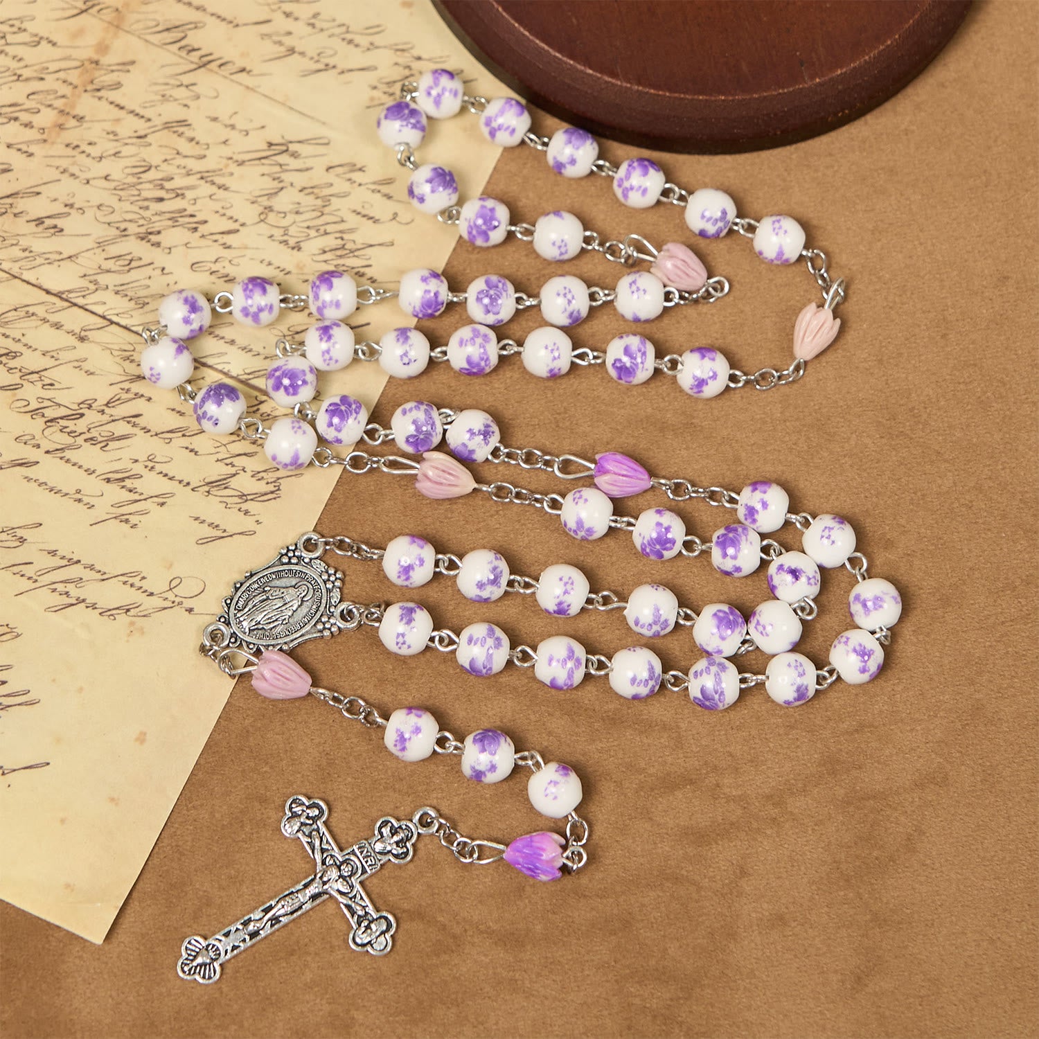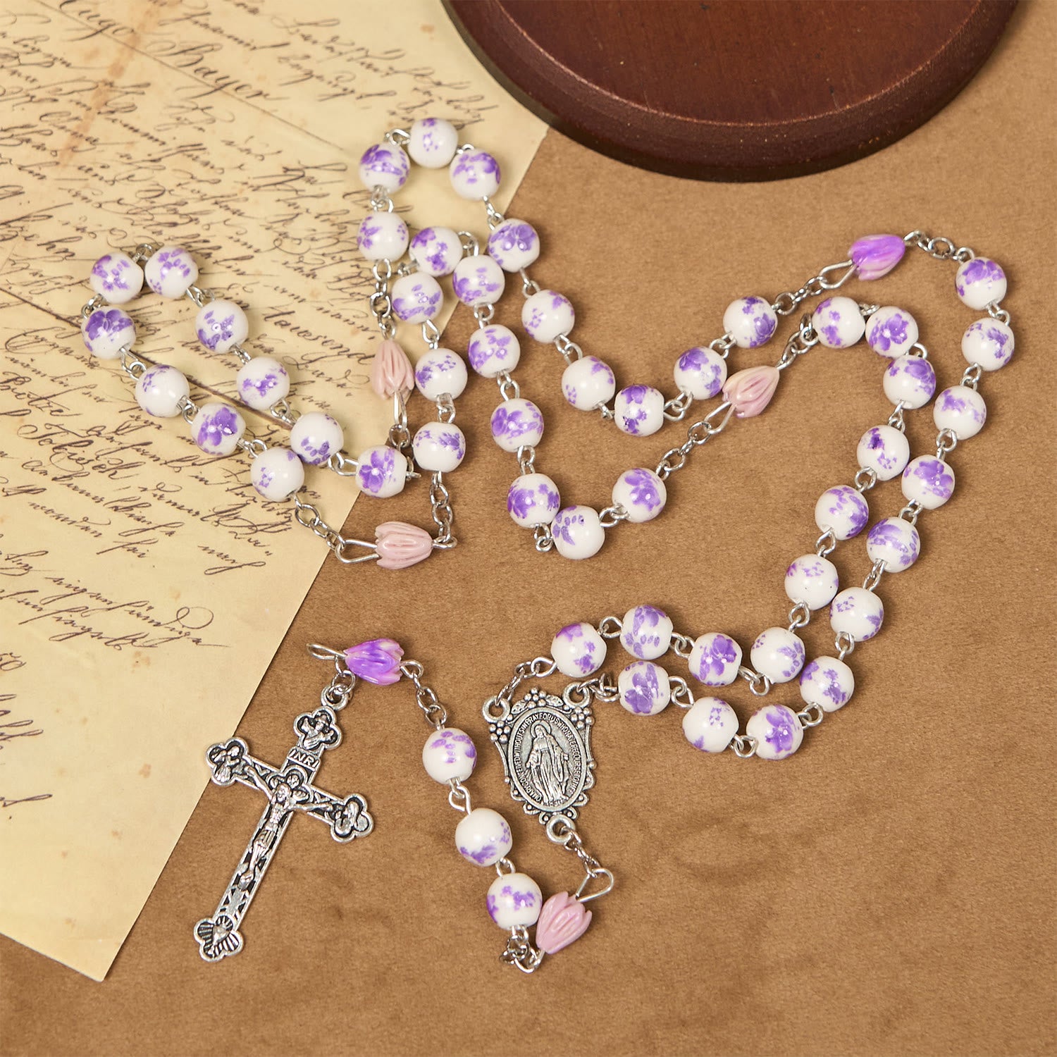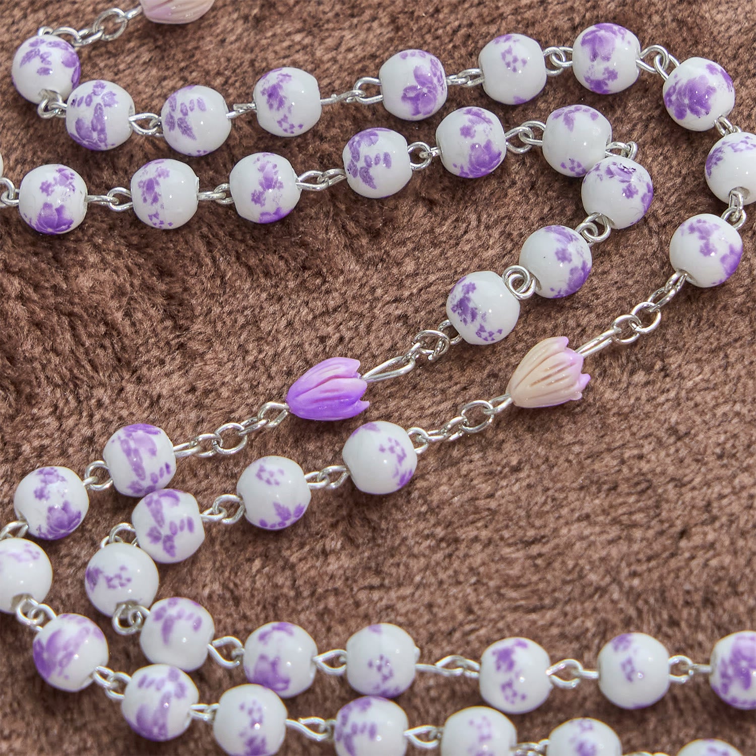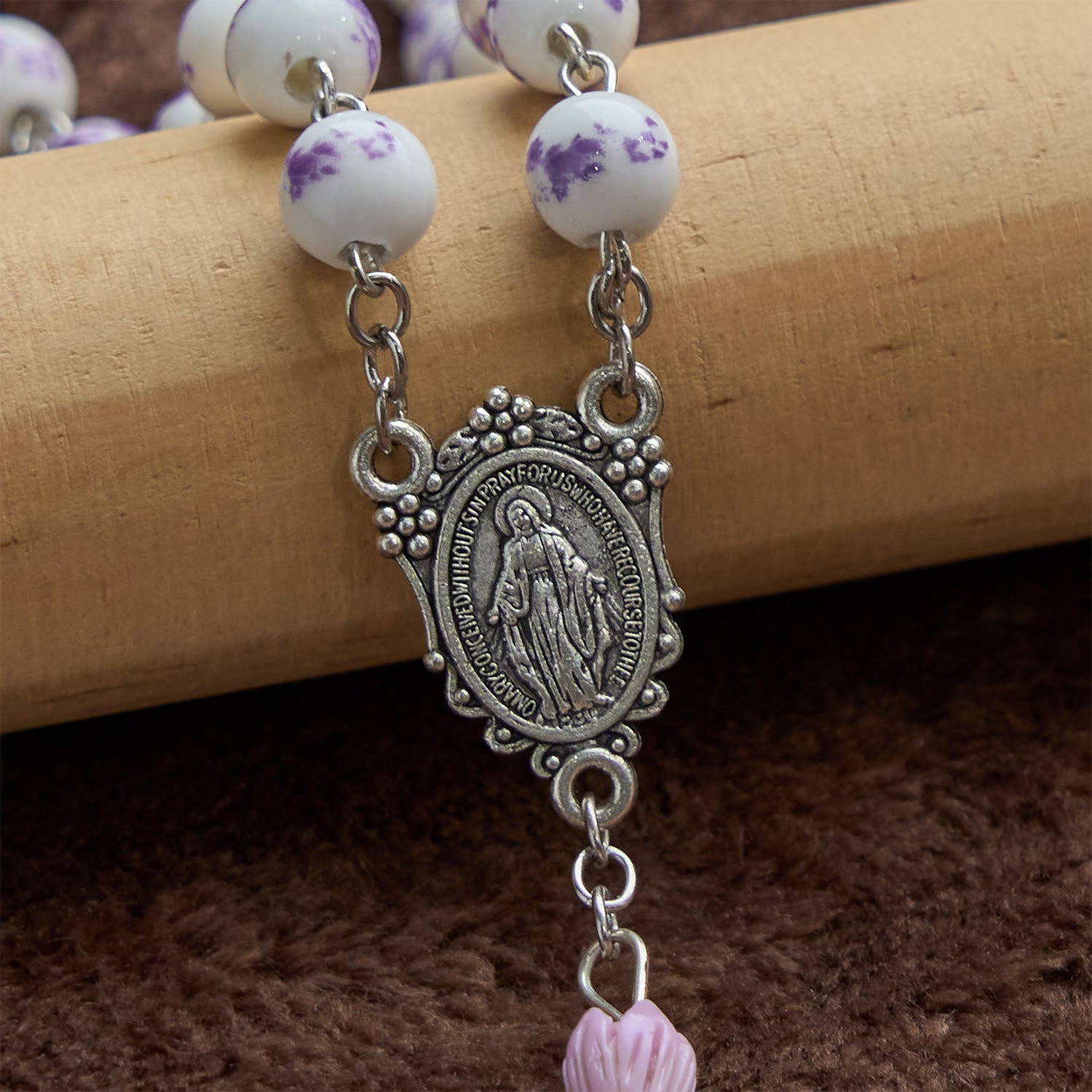 Il rosario presenta grani in ceramica, ciascuno decorato con intricati motivi floreali viola. Mentre si fanno scorrere le dita su questi grani lisci durante la preghiera, il loro fascino tattile offre un'esperienza rilassante e immersiva. Il materiale ceramico, con la sua delicata lavorazione, aggiunge un tocco di eleganza e atemporalità al vostro atto di adorazione.