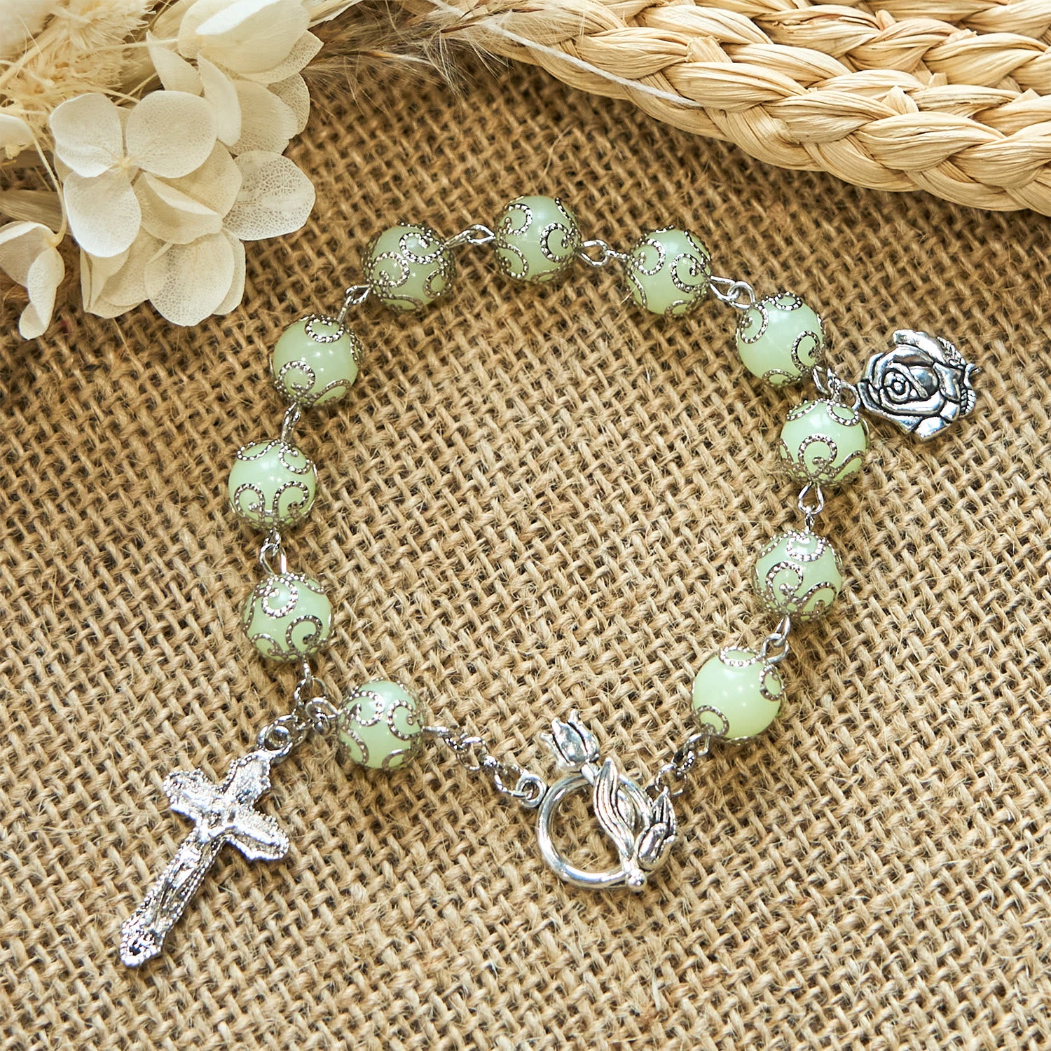 Bracciale luminoso con crocifisso e rosa in perline verdi: luce sognante della fede