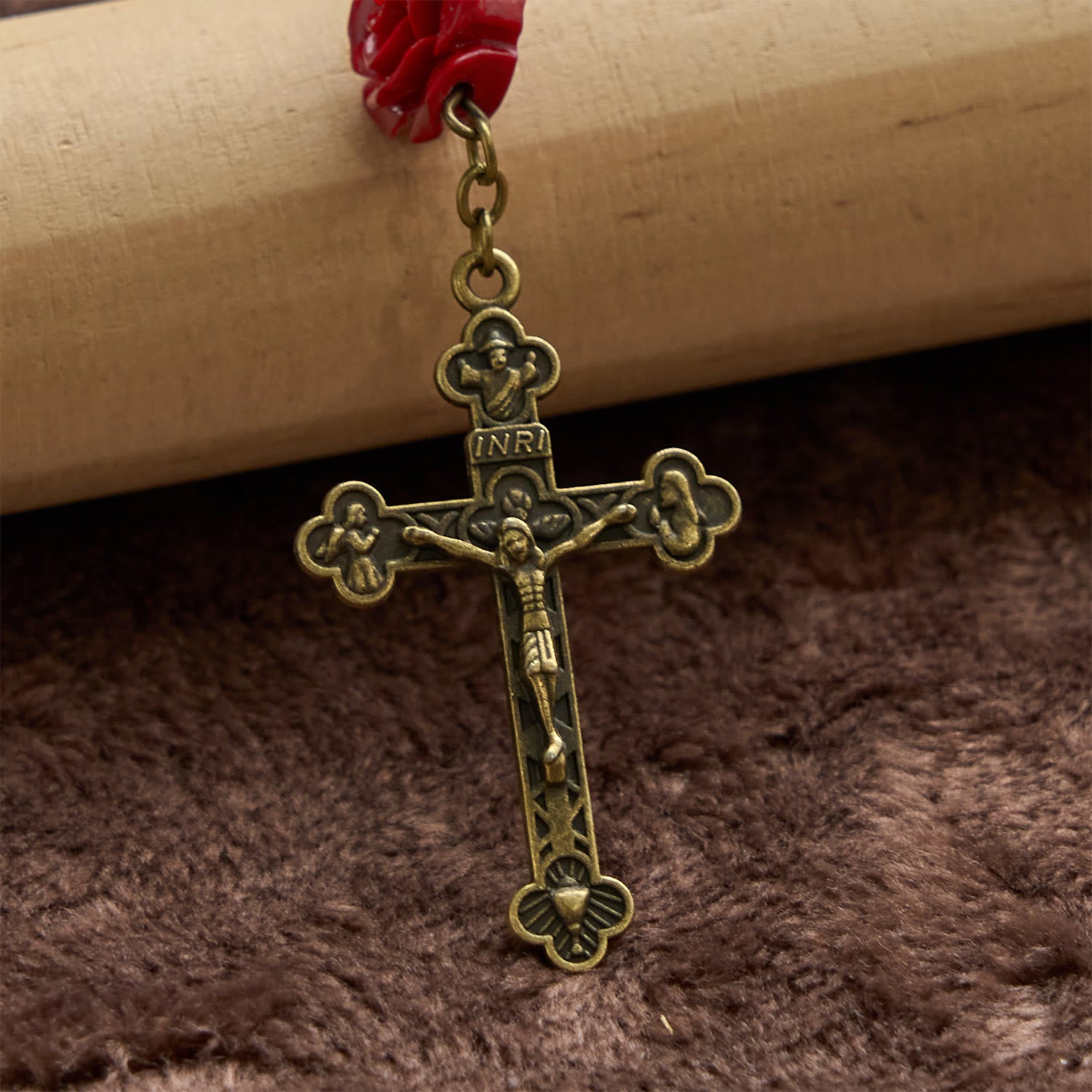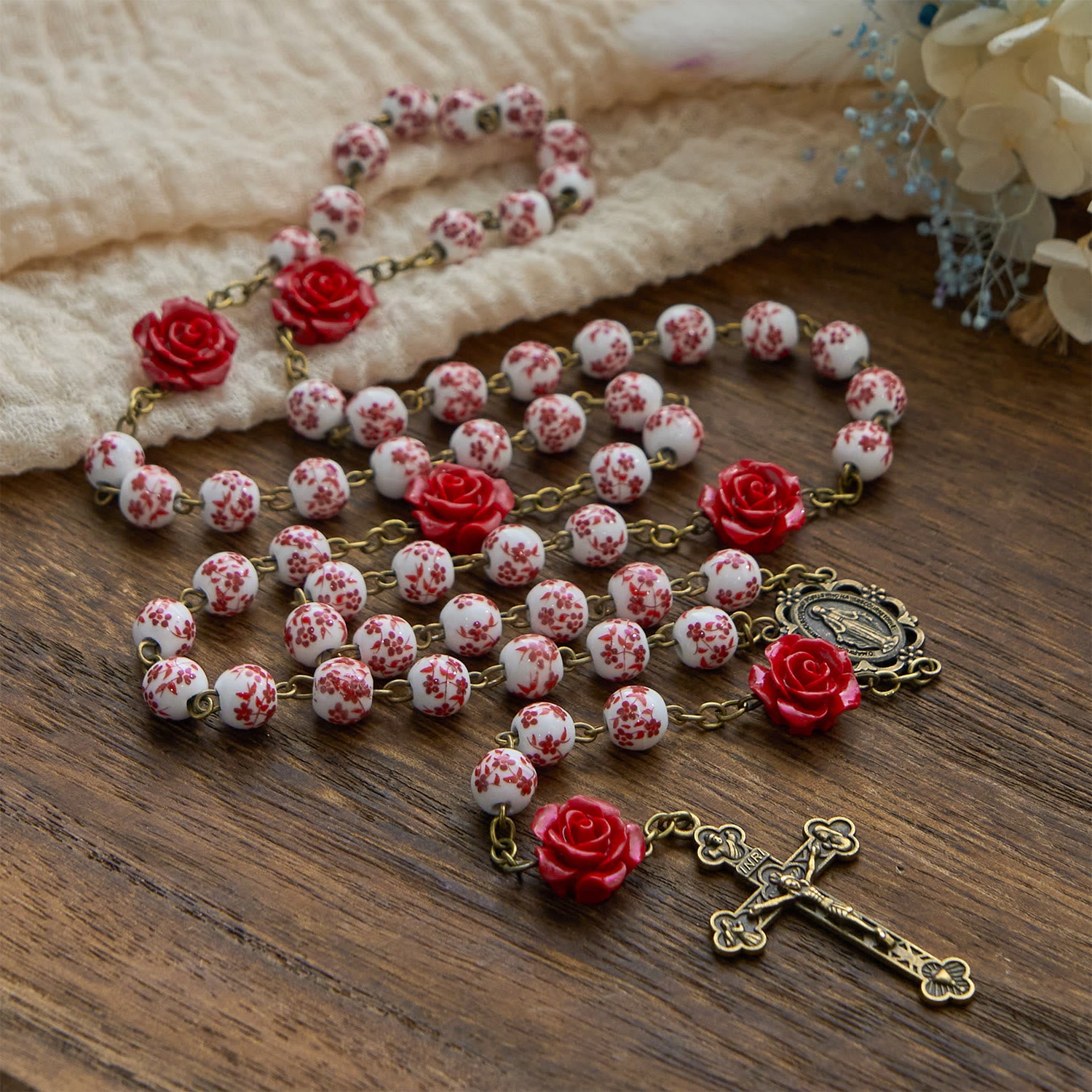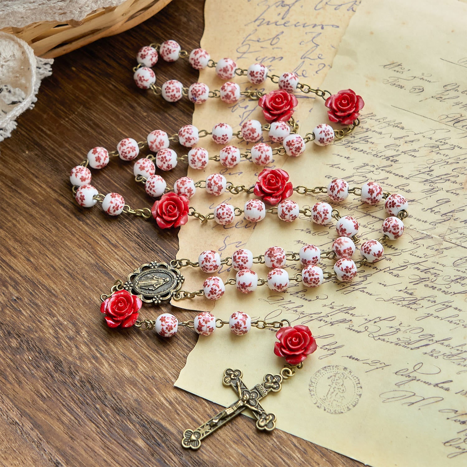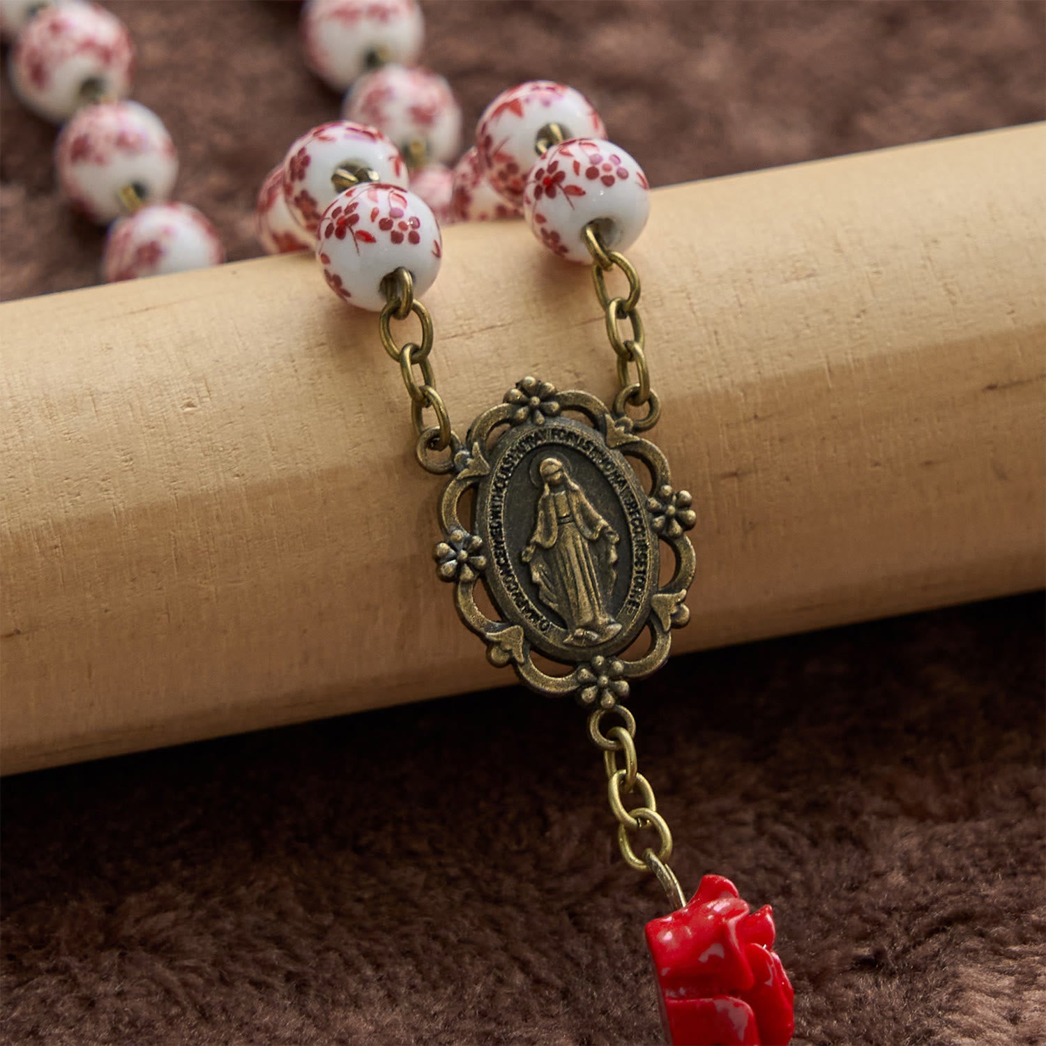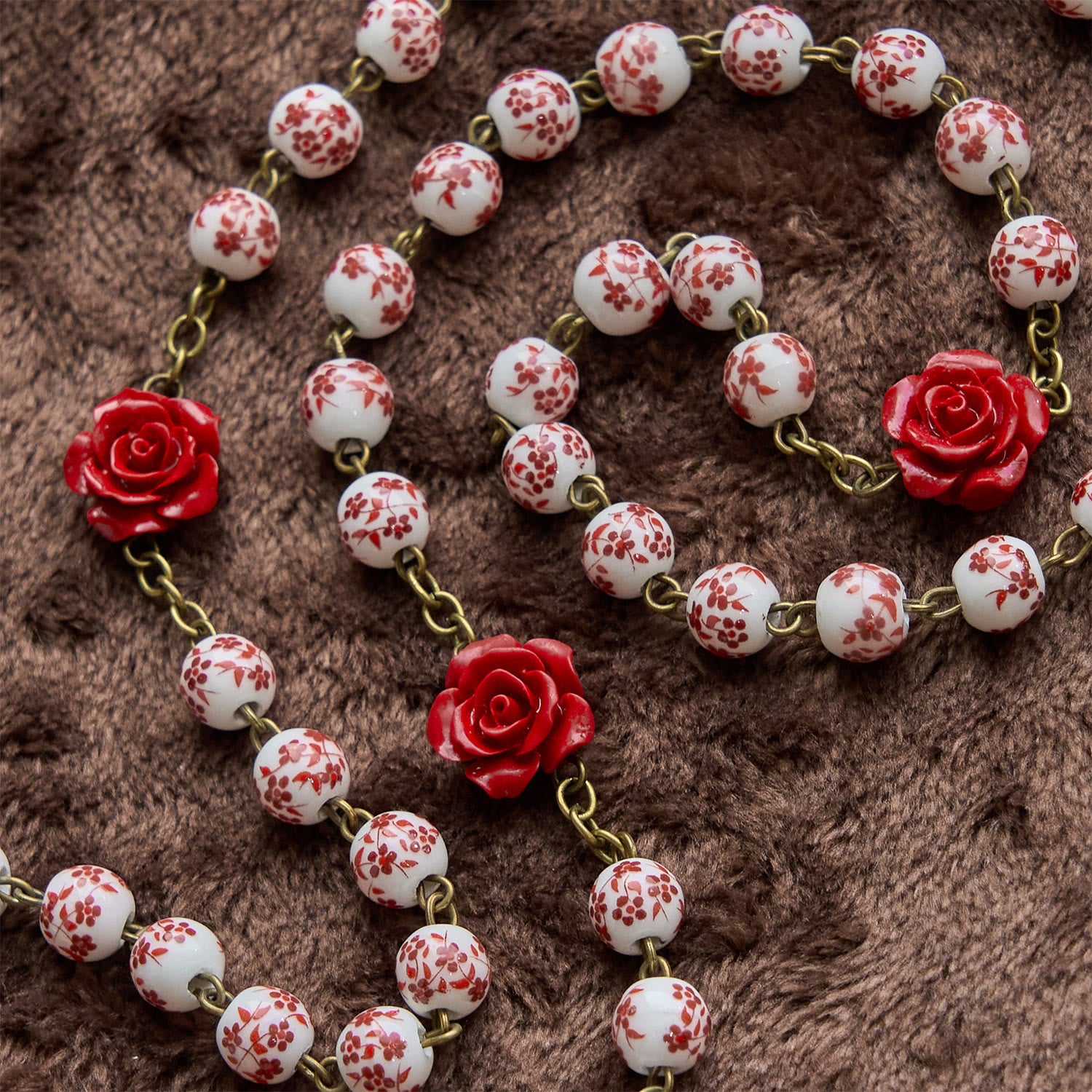 Tra le perle di ceramica si trovano rose lavorate a mano con il cinabro. La loro vivida tonalità non solo cattura l'attenzione, ma racchiude anche un profondo simbolismo. Il cinabro, da sempre associato alla protezione e alla spiritualità, e la rosa, emblema universale di amore e purezza, si uniscono per infondere alle vostre preghiere un significato più profondo.