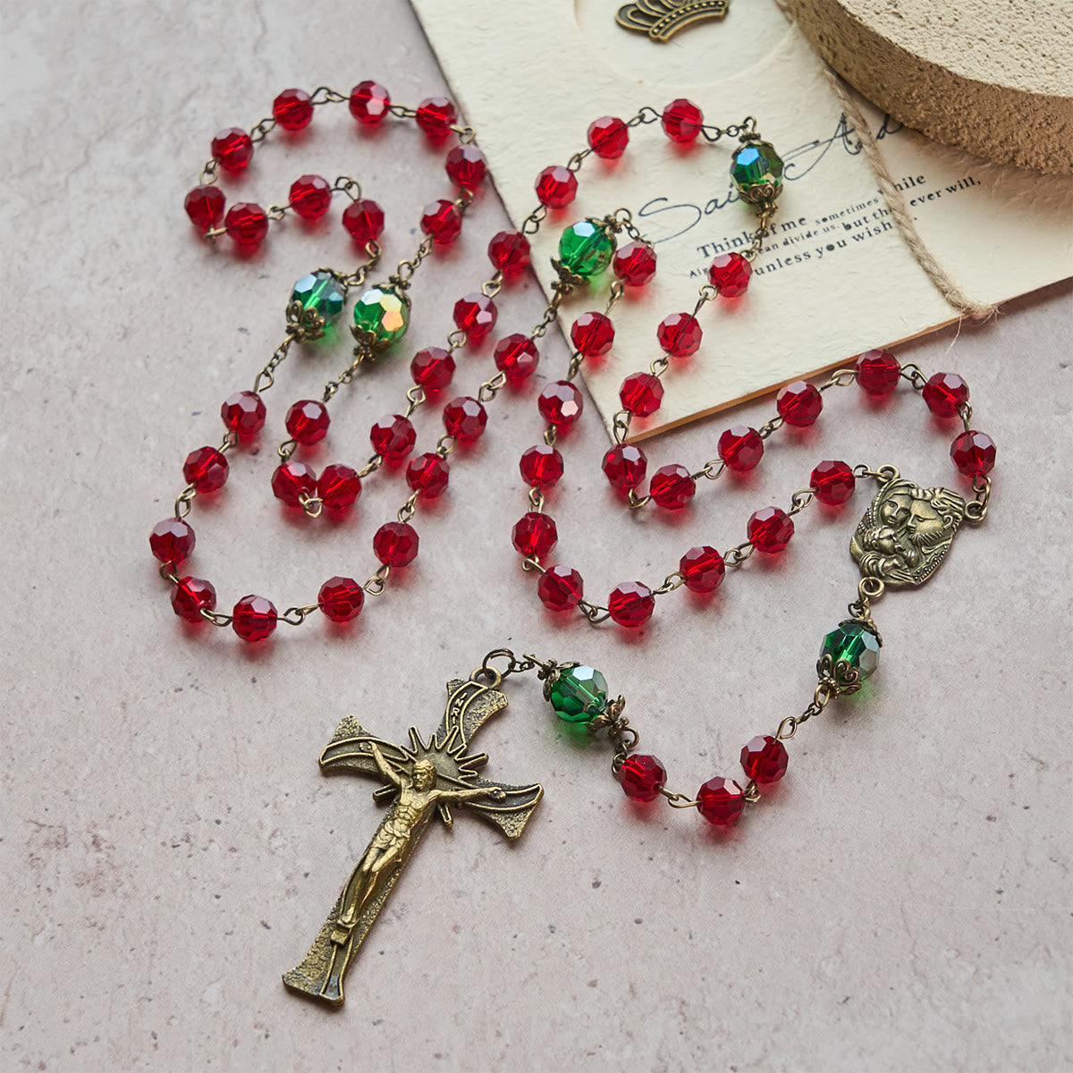 La combinazione di rosso e verde, accentuata dall'oro antico, incarna la gioia e la venerazione del periodo natalizio. I suoi colori radiosi rispecchiano la luce delle candele dell'Avvento e la promessa sempreverde di una nuova vita. Ogni perla brilla di devozione, trasformando la preghiera in un riflesso della grazia natalizia. - Un rosario di benedizione natalizia