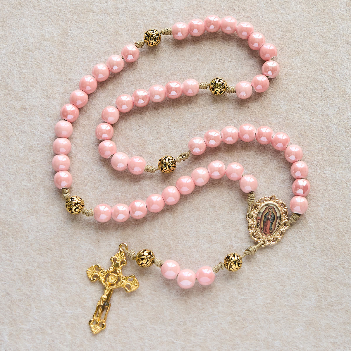 Tenue come l'alba e radioso come la fede, questo rosario in ceramica rosa risplende del calore della speranza natalizia. Ogni grano riflette la tenerezza della Vergine Maria, il cui umile "sì" ha portato la Luce nel mondo. - Perline rosa e un cuore dorato di fede