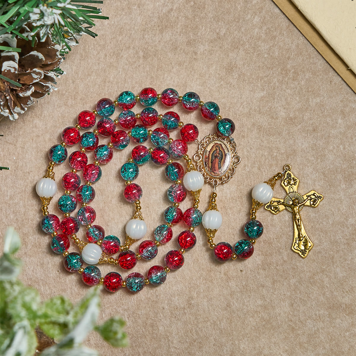 Realizzato a mano con perline di vetro natalizie rosso-blu, questo rosario presenta una medaglia della Madonna di Guadalupe e una croce dorata, unendo la vivacità delle feste alla riverenza spirituale in ogni decina. - Medaglia della Madonna di Guadalupe: Protezione Materna