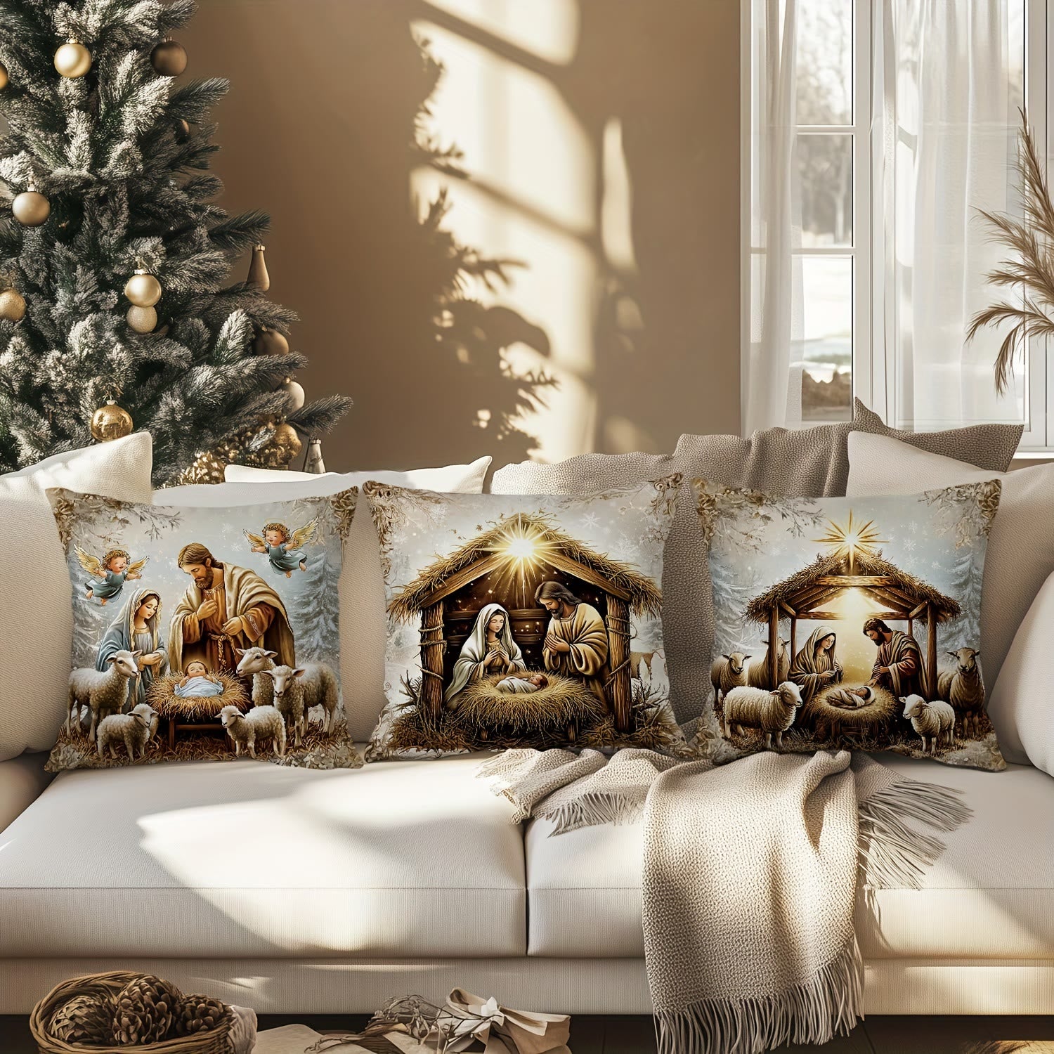Questo set di cuscini fonde scene sacre della natività (stella guida, angeli, figure gentili) con un design in tessuto morbido, fondendo il significato spirituale con il comfort delle feste per creare un caldo elemento d'arredo stagionale.