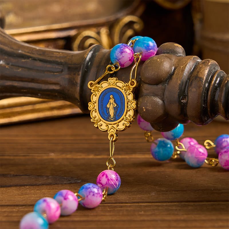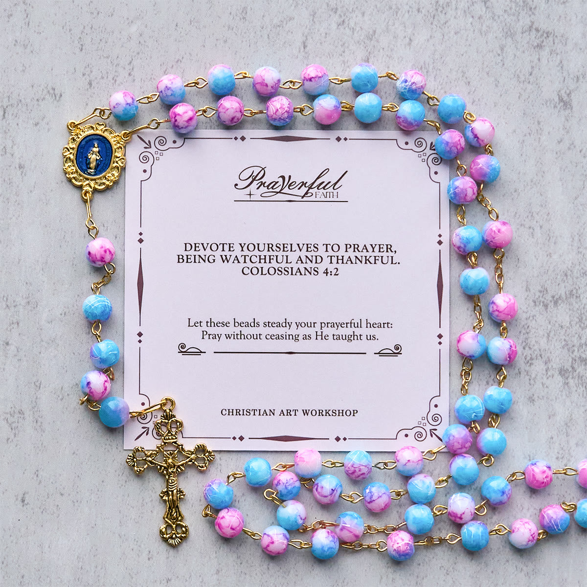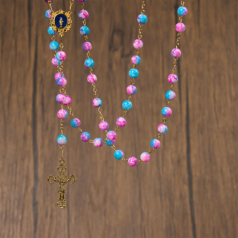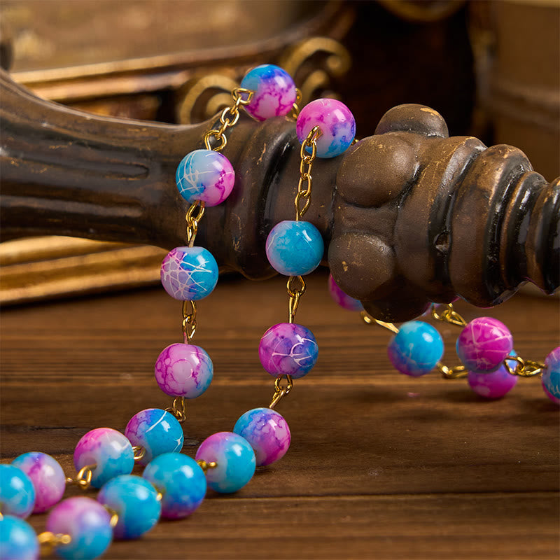 Perline vivaci: il rosario presenta splendide perline nei toni del blu e del rosa, che simboleggiano serenità e amore. Le perline colorate non solo lo rendono visivamente accattivante, ma hanno anche un effetto calmante durante la preghiera.