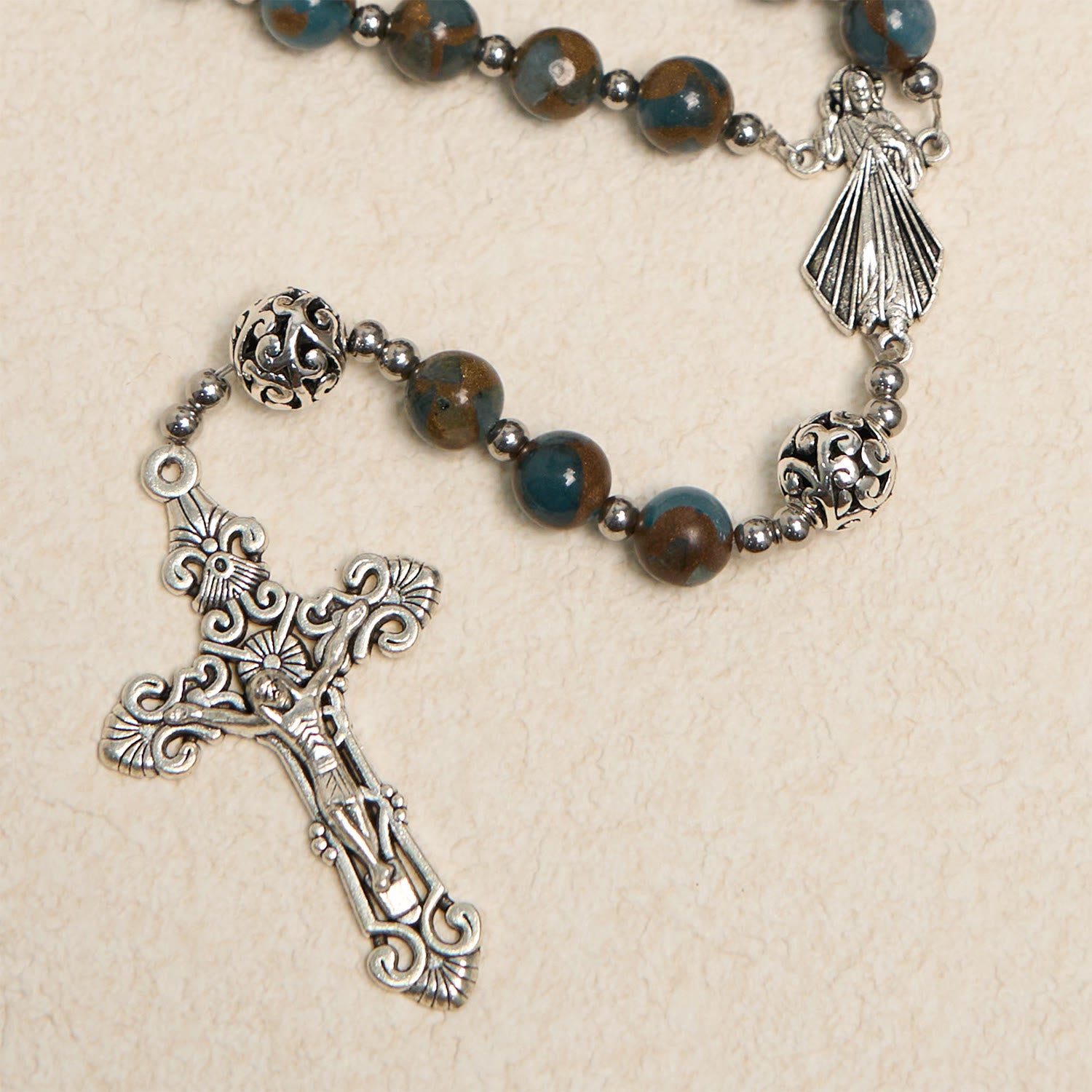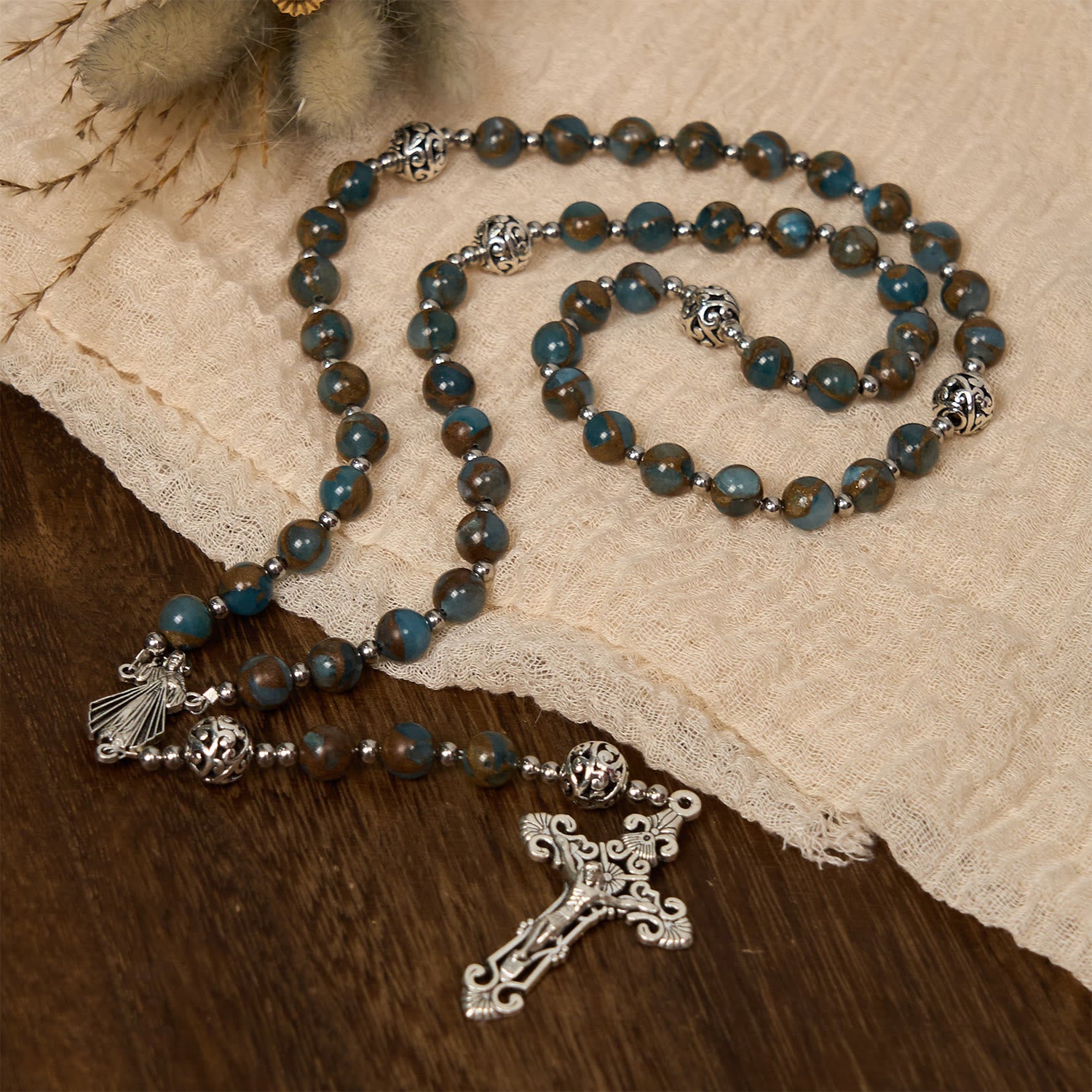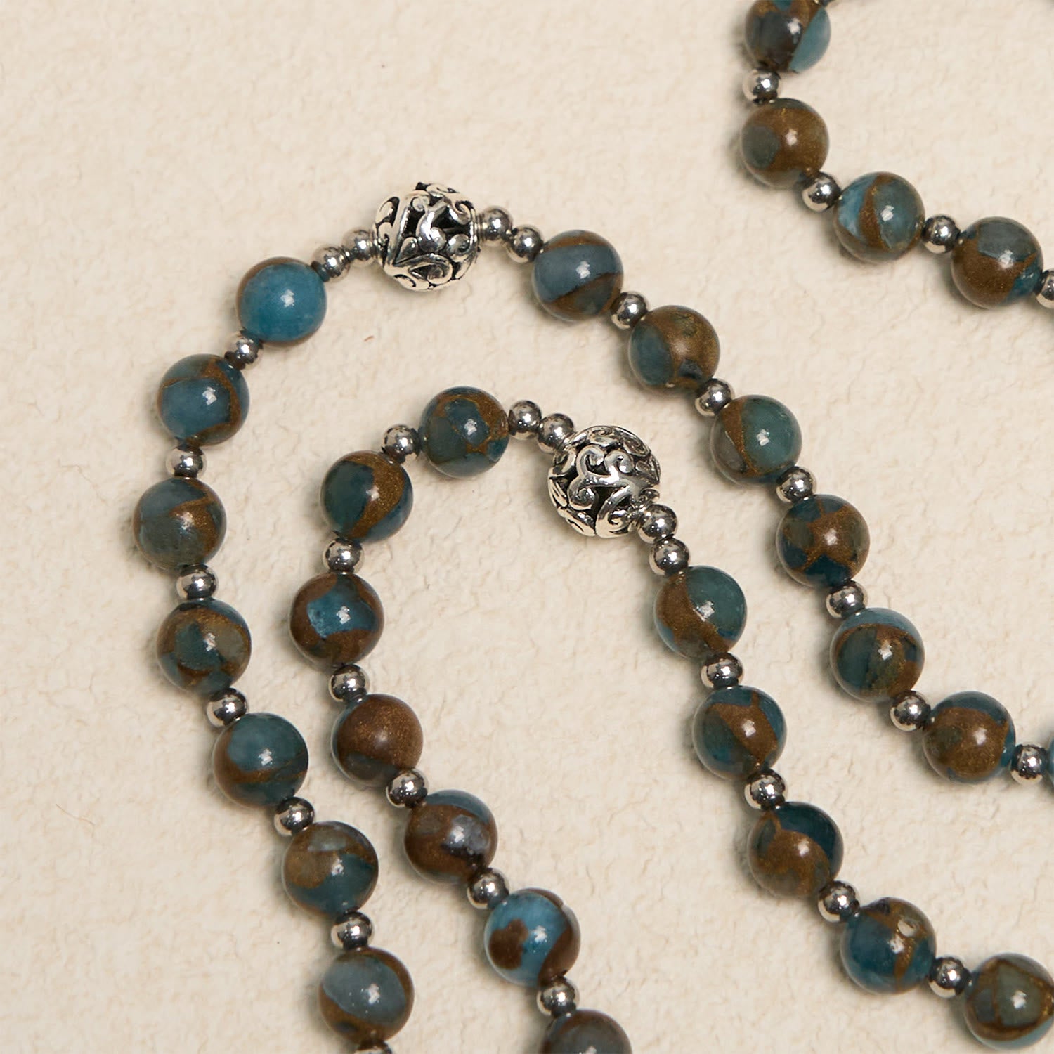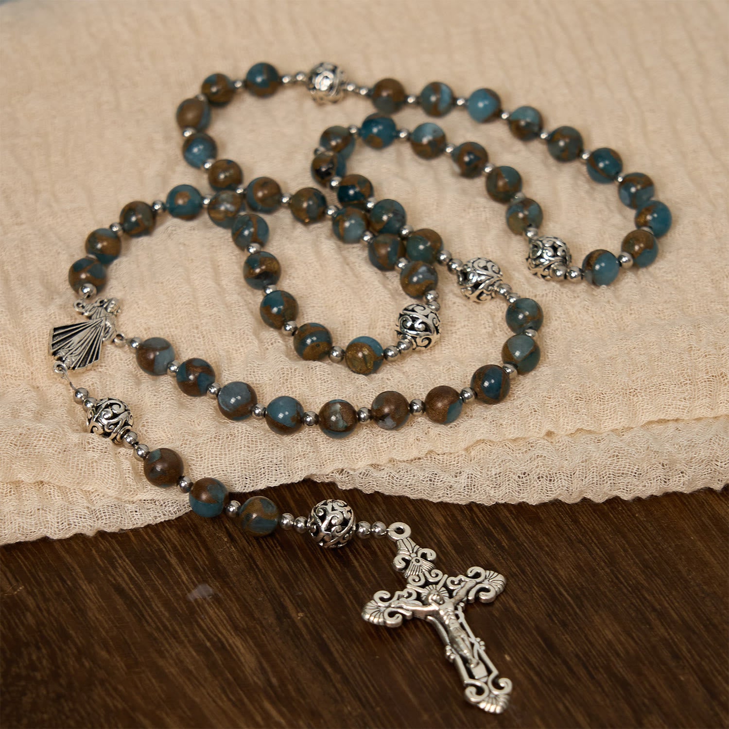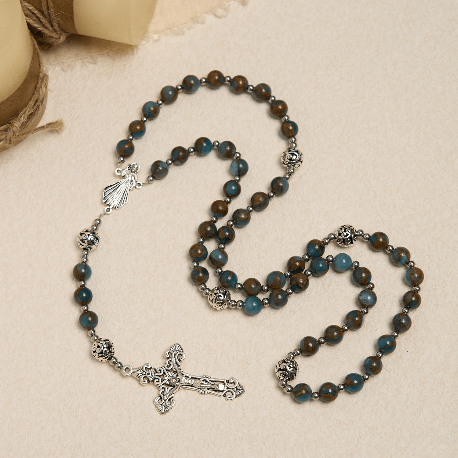 Questo rosario è più di un semplice gioiello: è un legame tangibile con la tua fede. I grani, realizzati con un'armoniosa miscela di blu intenso e tonalità terrose, simboleggiano la vastità del cielo divino e la forza radicante della terra. Ogni grano è un promemoria delle preghiere recitate e che saranno recitate, un passo nel cammino spirituale.Un simbolo di devozione