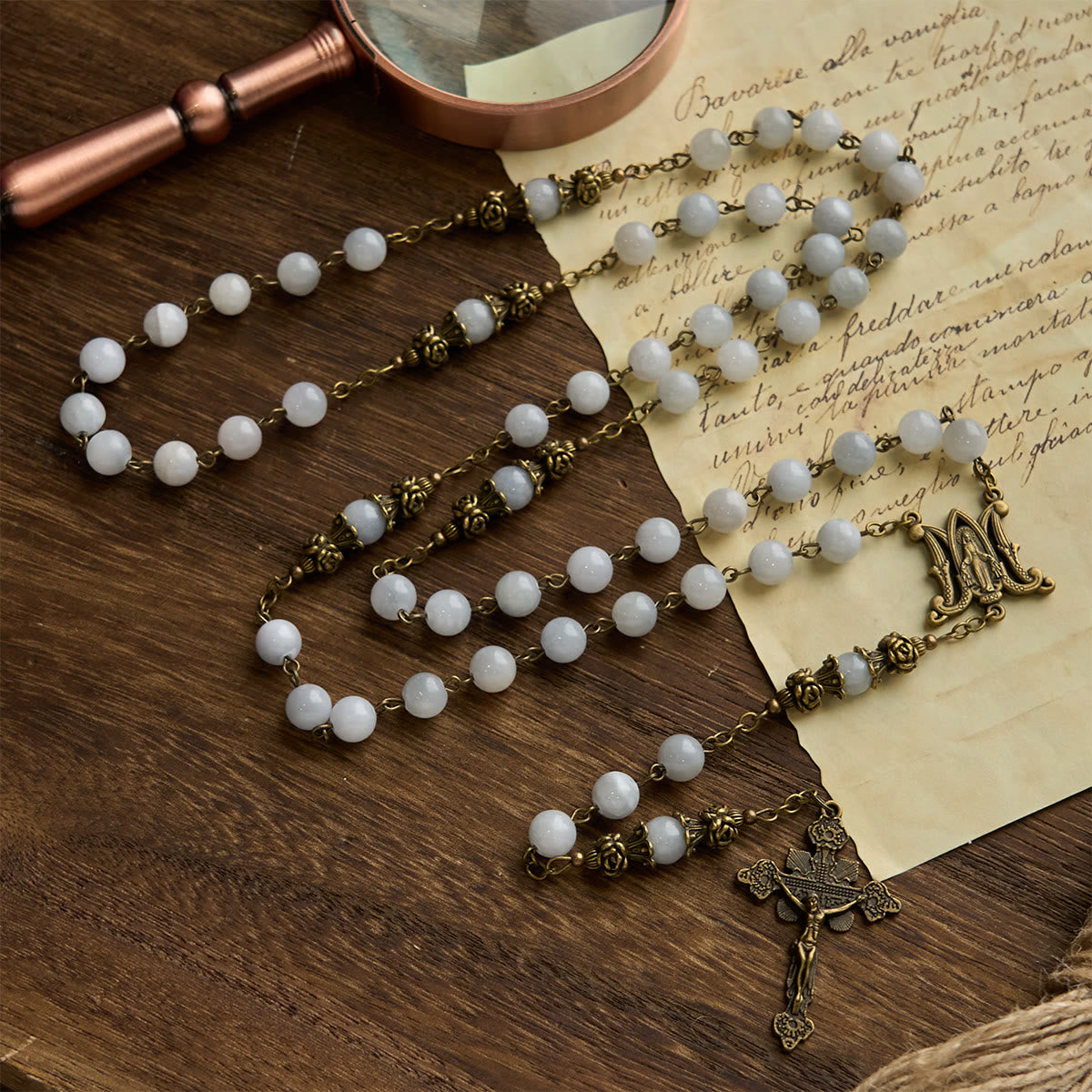 Ogni grano bianco di questo rosario è un trampolino di lancio verso il divino. Liscio al tatto, invita a fermarsi, a respirare e a entrare in preghiera. Quando le dita scivolano su di esso, si crea una connessione fisica con il sacro, un modo per zittire il rumore del mondo e concentrarsi su Cristo. Questi grani non sono solo oggetti; sono catalizzatori per il risveglio spirituale, aiutando ad aprire il cuore alla presenza di Dio a ogni conteggio. - Simboli di fede duratura