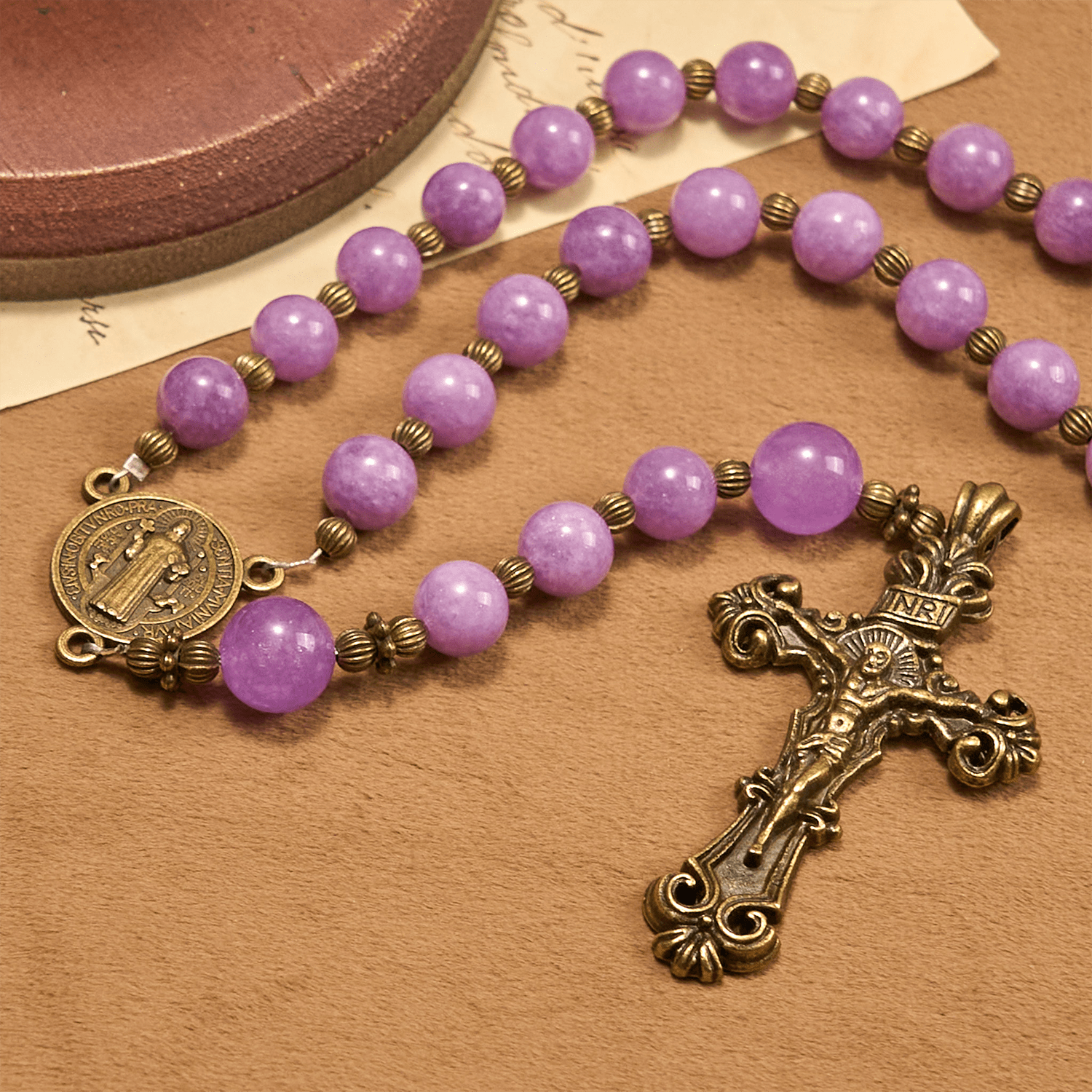Le perle di calcedonio granato viola sono selezionate a mano per la loro consistenza liscia e la tonalità profonda e uniforme, che le rende resistenti all'usura pur mantenendo il loro fascino lucente. Gli accessori in metallo, dal crocifisso decorato alla dettagliata medaglia di San Benedetto, sono sottoposti a un trattamento antiossidante per una bellezza duratura. Dalla rotondità uniforme delle perle alla precisa incisione dei simboli religiosi, rigorosi standard di qualità garantiscono che questo rosario sia un accessorio spirituale di qualità superiore, che fonde bellezza naturale ed eccellenza artigianale. - Benedizioni sincere, simbolo di salvaguardia