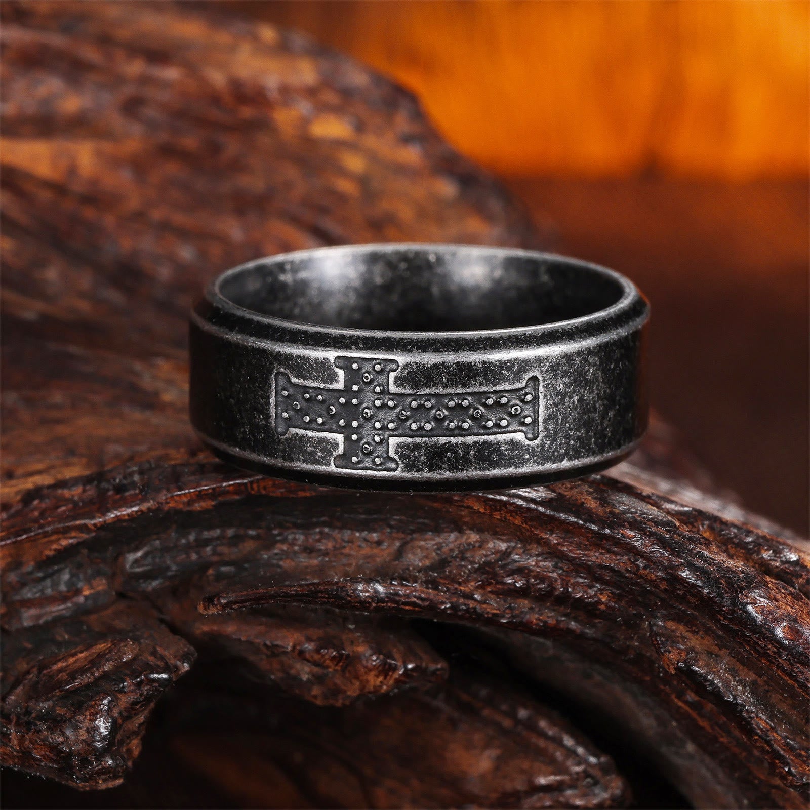 Questo anello con emblema della croce fonde il significato sacro della croce (segno di speranza e sacrificio) con un design robusto e strutturato. Crea un legame sottile ma significativo con lo scopo spirituale.