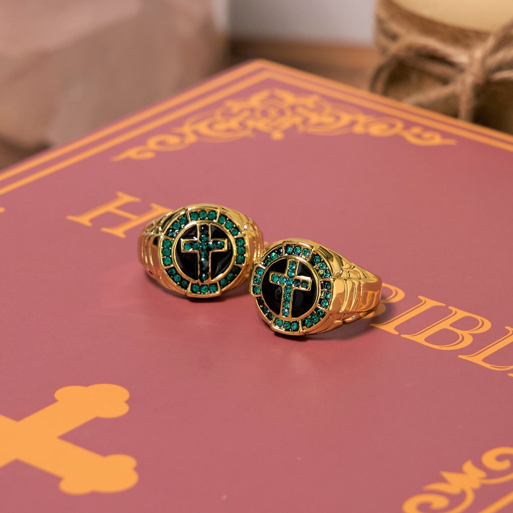 Realizzato con materiali di alta qualità, questo anello presenta una ricca montatura in oro impreziosita da scintillanti pietre color smeraldo. La vivace combinazione di verde e oro emana raffinatezza, rendendolo un accessorio di spicco che funge anche da spunto di conversazione sulla tua fede. - Disegno della croce centrale: un potente simbolo di fede