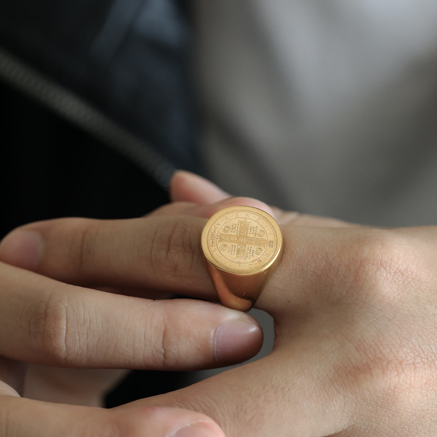 Porta la tua fede con te ogni giorno con questo anello dal design elaborato, con audaci incisioni di San Benedetto ed eleganti motivi a volute. Combinando perfettamente stile e devozione, questo anello è più di un semplice accessorio: è una dichiarazione delle tue convinzioni.