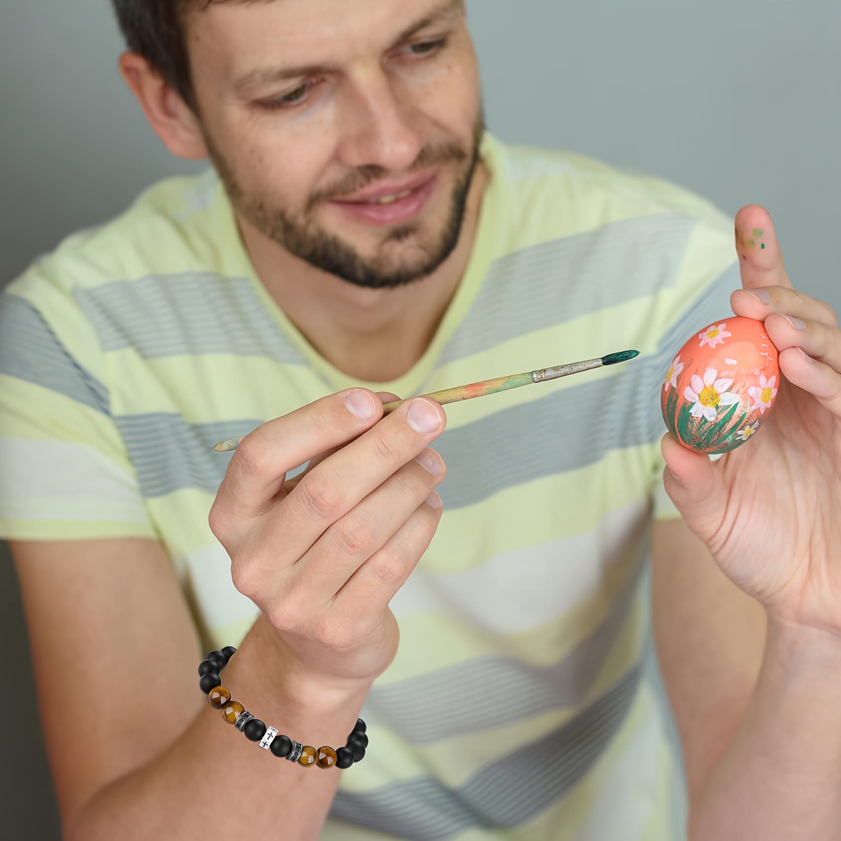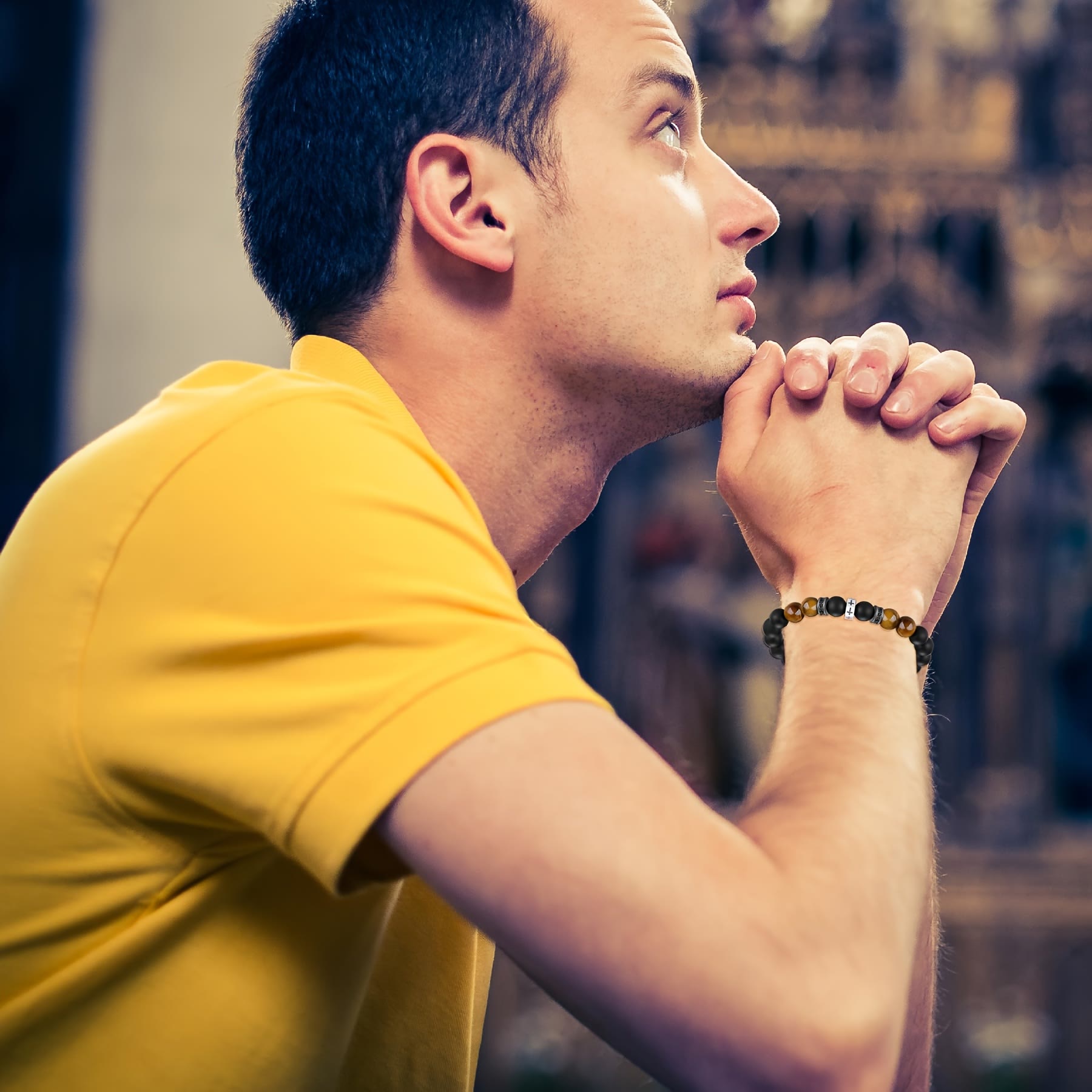 Realizzato con onice nero opaco, perle di occhio di tigre lucido e una croce decorativa, questo braccialetto è un regalo sentito per i ragazzi in occasione della loro Cresima, ricordando loro il sostegno divino ovunque vadano. - Un segno di fede e coraggio