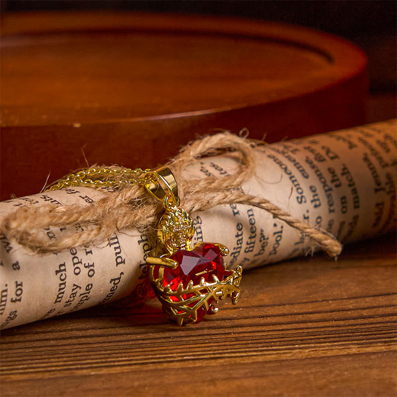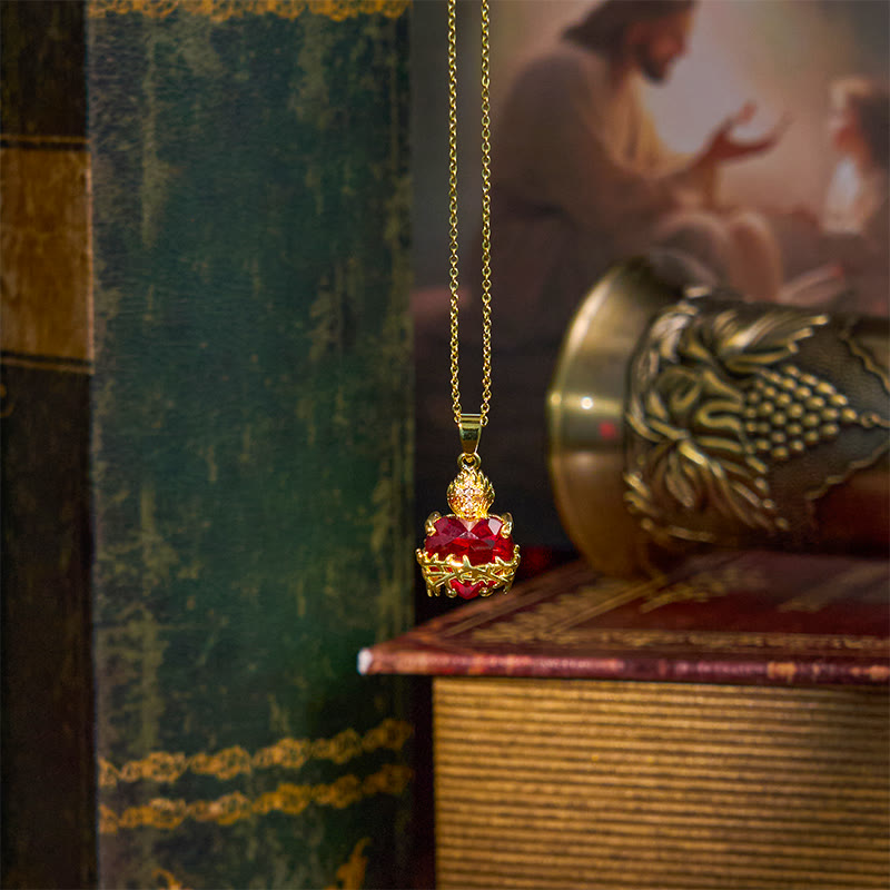 La collana presenta un cuore sacro splendidamente dettagliato, avvolto in una corona di spine e fiammeggiante, a simboleggiare l'amore eterno di Cristo e la sua appassionata devozione per l'umanità. Il vibrante cristallo rosso del cuore risplende di vita, mentre gli elementi dorati aggiungono un tocco di divina eleganza, rendendolo una potente dichiarazione di fede.