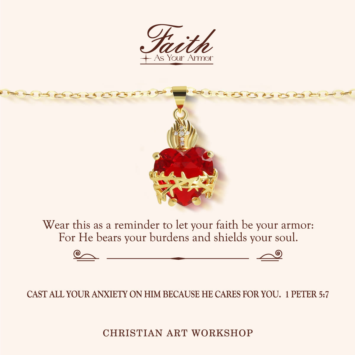 Christianartworkshop LA FEDE COME ARMATURA: Collana con ciondolo del Sacro Cuore di Gesù con pietre preziose rosse