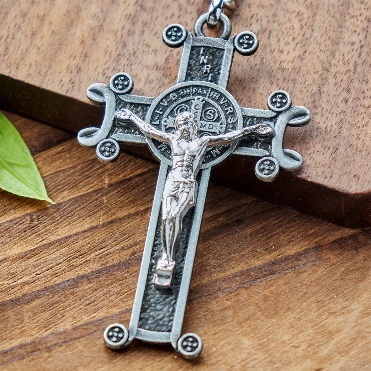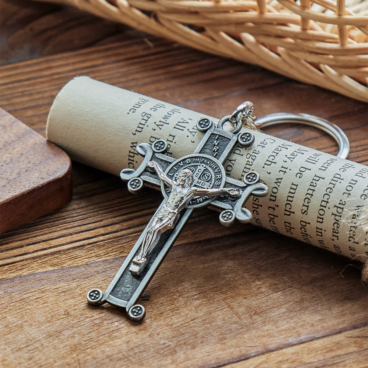 Questo portachiavi a forma di crocifisso unisce il profondo simbolo della Croce alla forza spirituale della Medaglia di San Benedetto, consentendoti di tenere a portata di mano sia il sacrificio salvifico di Cristo sia la protezione divina.