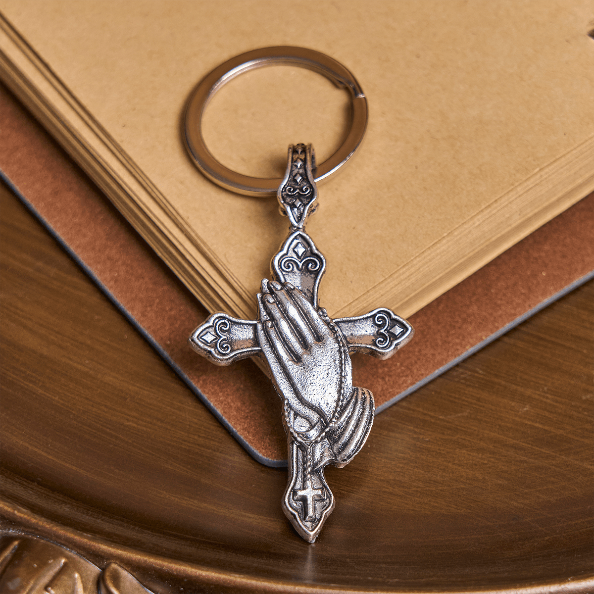 Portachiavi con croce e mani in preghiera, fede in ogni passo, da tenere in tasca