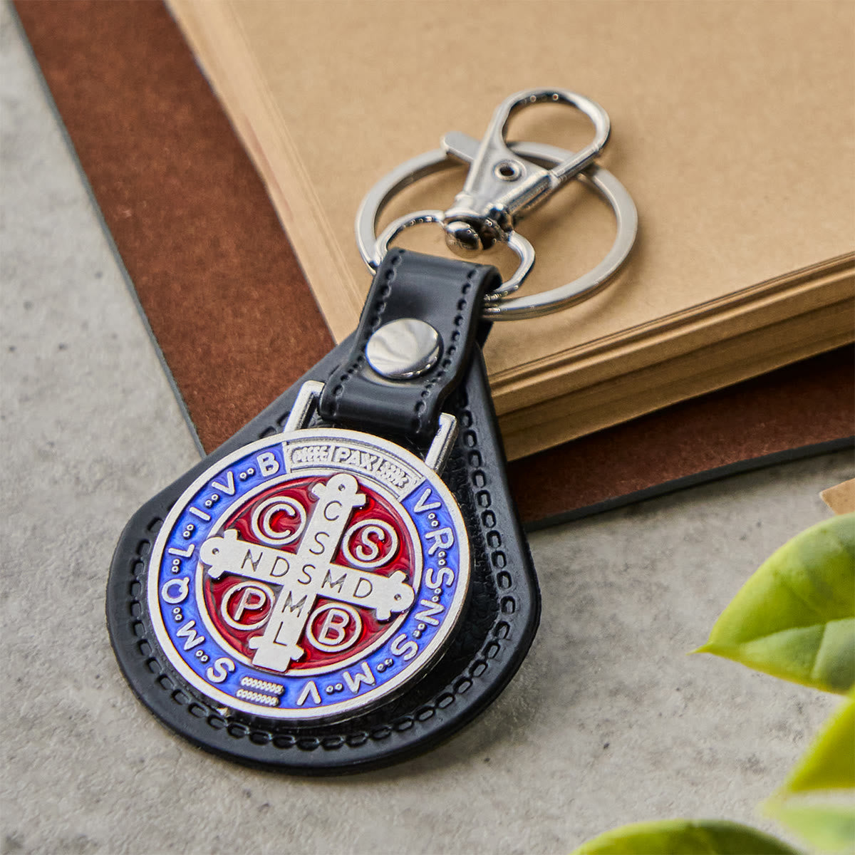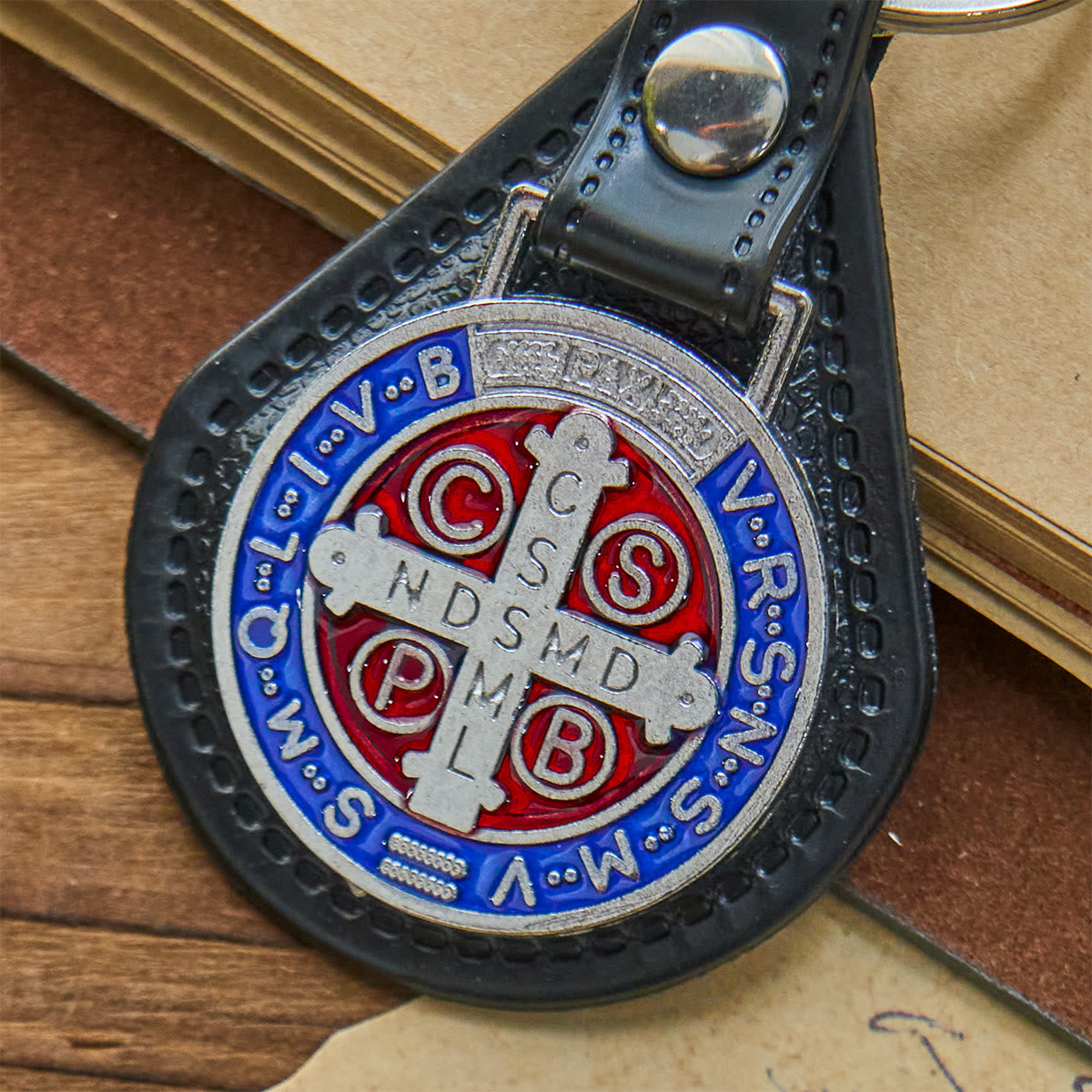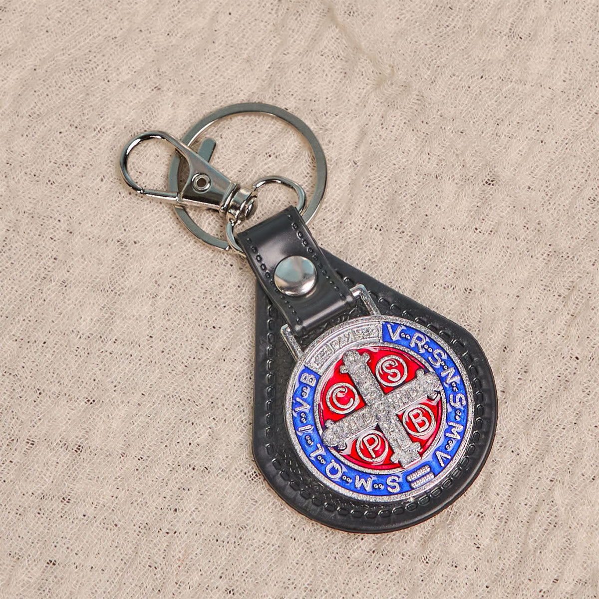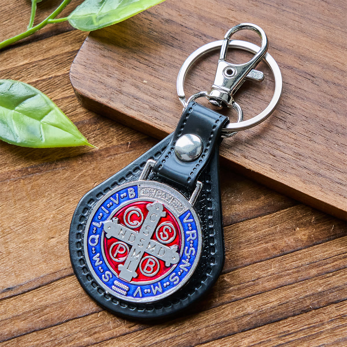 Portachiavi in pelle con croce di San Benedetto per la protezione spirituale quotidiana