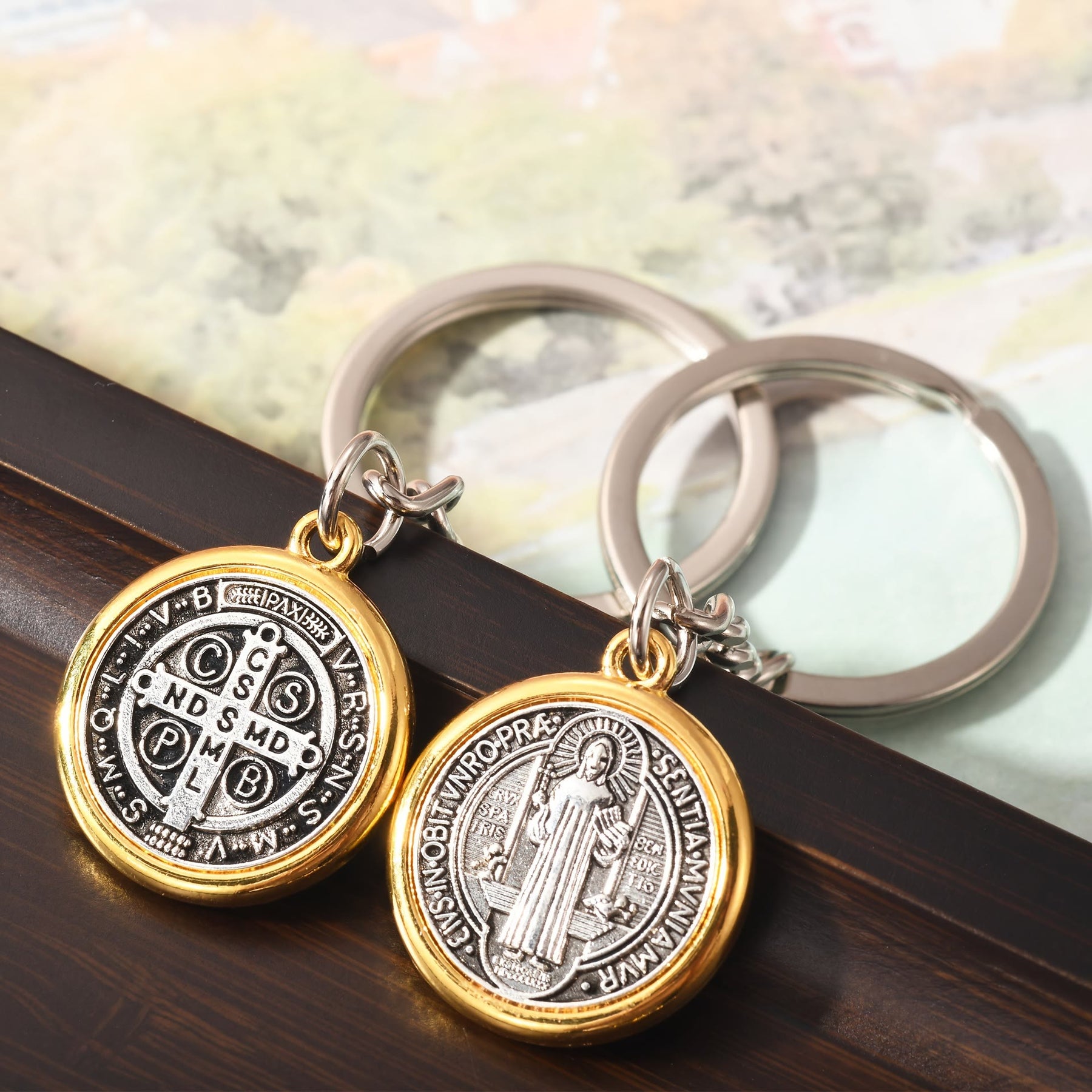 Classico portachiavi di San Benedetto con bordi dorati e motivi intricati: simbolo senza tempo di devozione spirituale