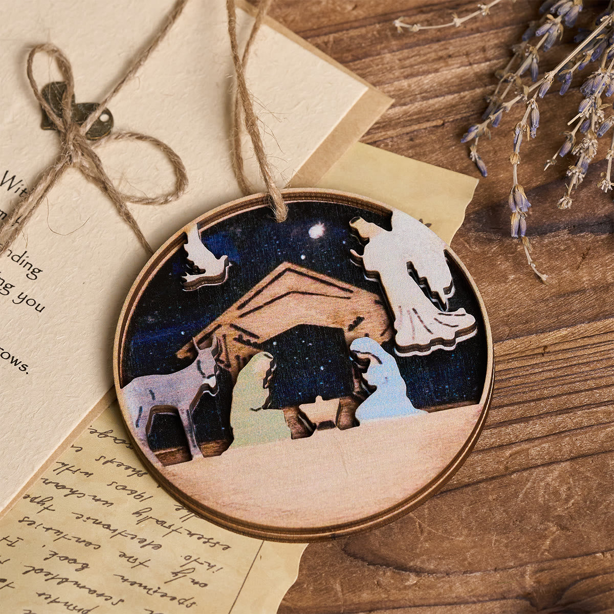 Decorato con un dettagliato presepe 3D, che include la Sacra Famiglia, l'angelo e la colomba, ogni pezzo fonde il calore del Natale con una fede reverente. Il design rende omaggio al vero significato della stagione, invitando a una profonda connessione con la narrazione sacra. - Devozione intrecciata con arte 3D e fede senza tempo