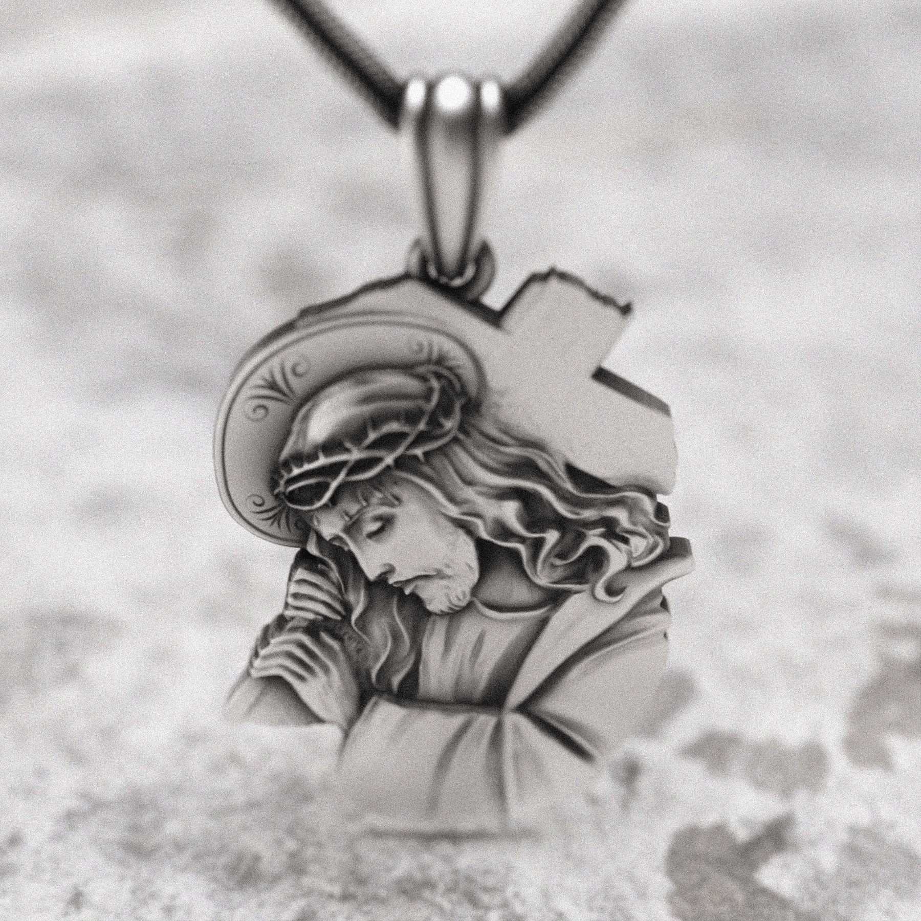 Una classica figura di Cristo porta la corona di spine sulla croce, simbolo eterno della sofferenza trasformata in amore sconfinato che riposa vicino al tuo cuore.