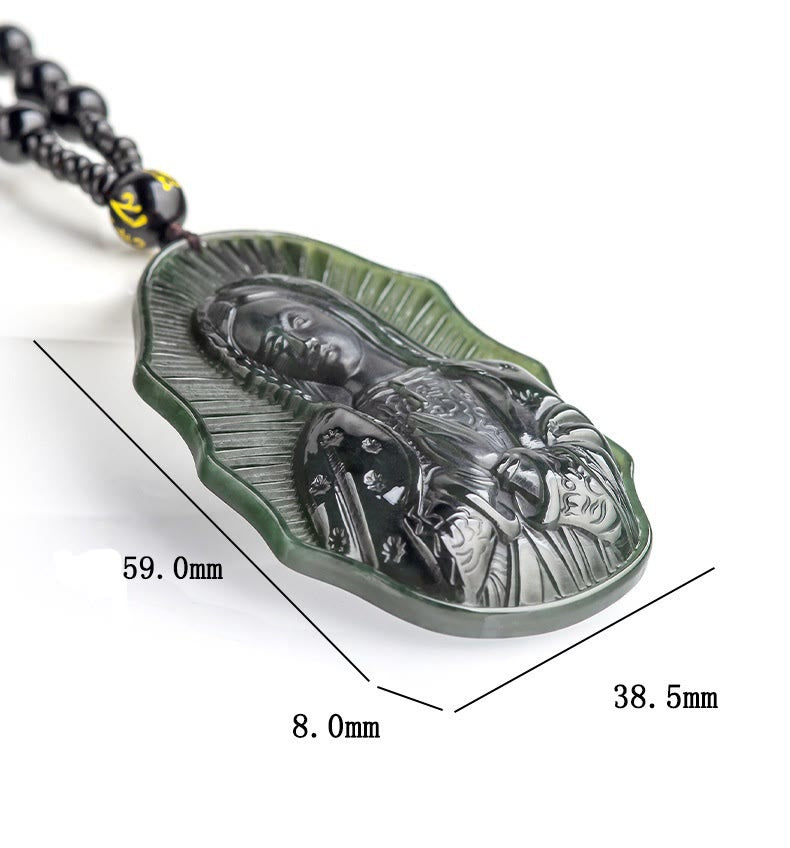 Realizzato in giada nera di Hetian di alta qualità, questo splendido pendente presenta dettagli intricati che ne esaltano la maestria artigianale e il profondo significato spirituale. La giada scura aggiunge un tocco di eleganza e riverenza, rendendolo un'aggiunta unica alla vostra collezione di oggetti religiosi. - Porta la tua fede vicino