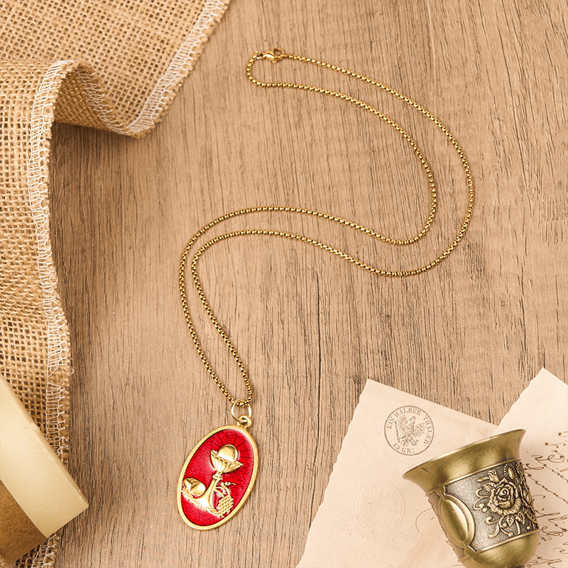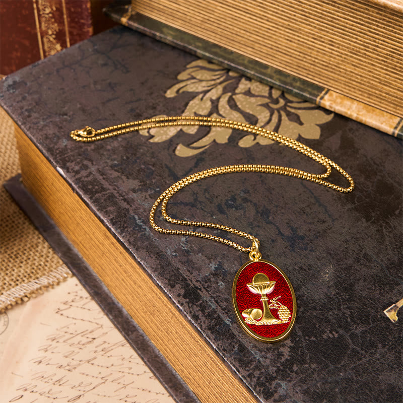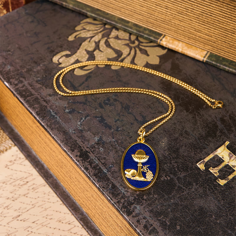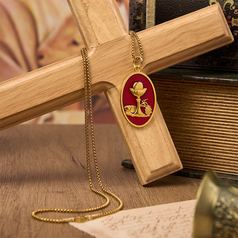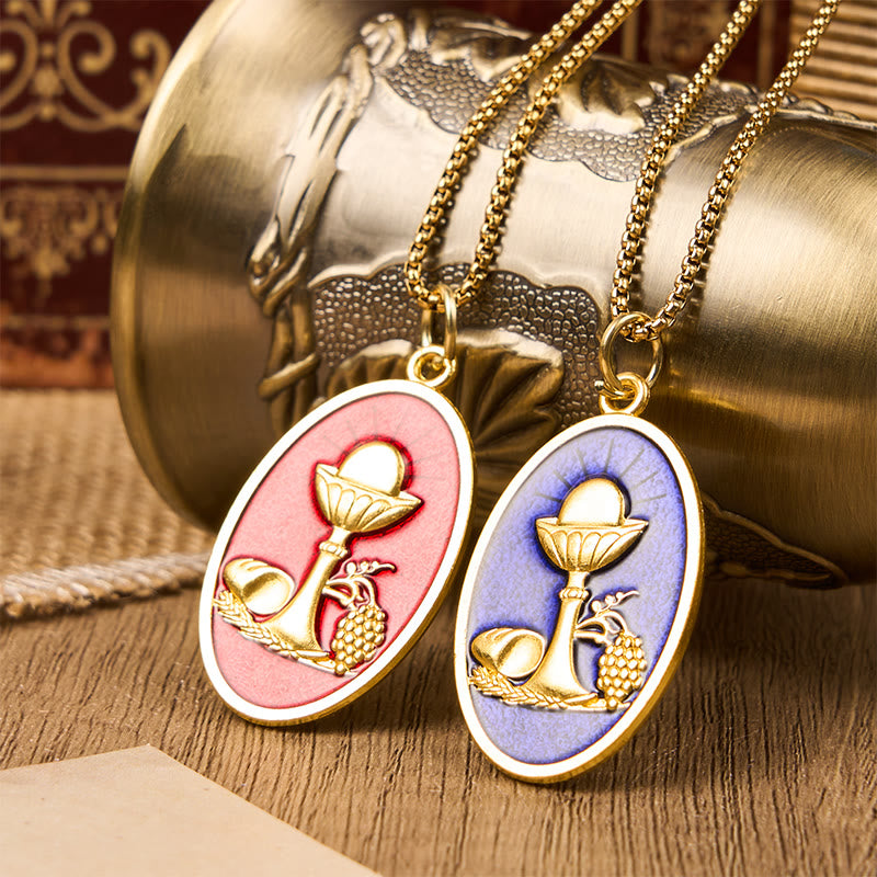 La collana vanta uno splendido pendente raffigurante il calice eucaristico, l'ostia, il grano e la vite, simboli del corpo e del sangue di Cristo. Questi elementi sono finemente lavorati in tonalità oro su uno sfondo di smalto rosso o blu, creando un contrasto sorprendente che ne enfatizza il significato sacro. - Significato spirituale