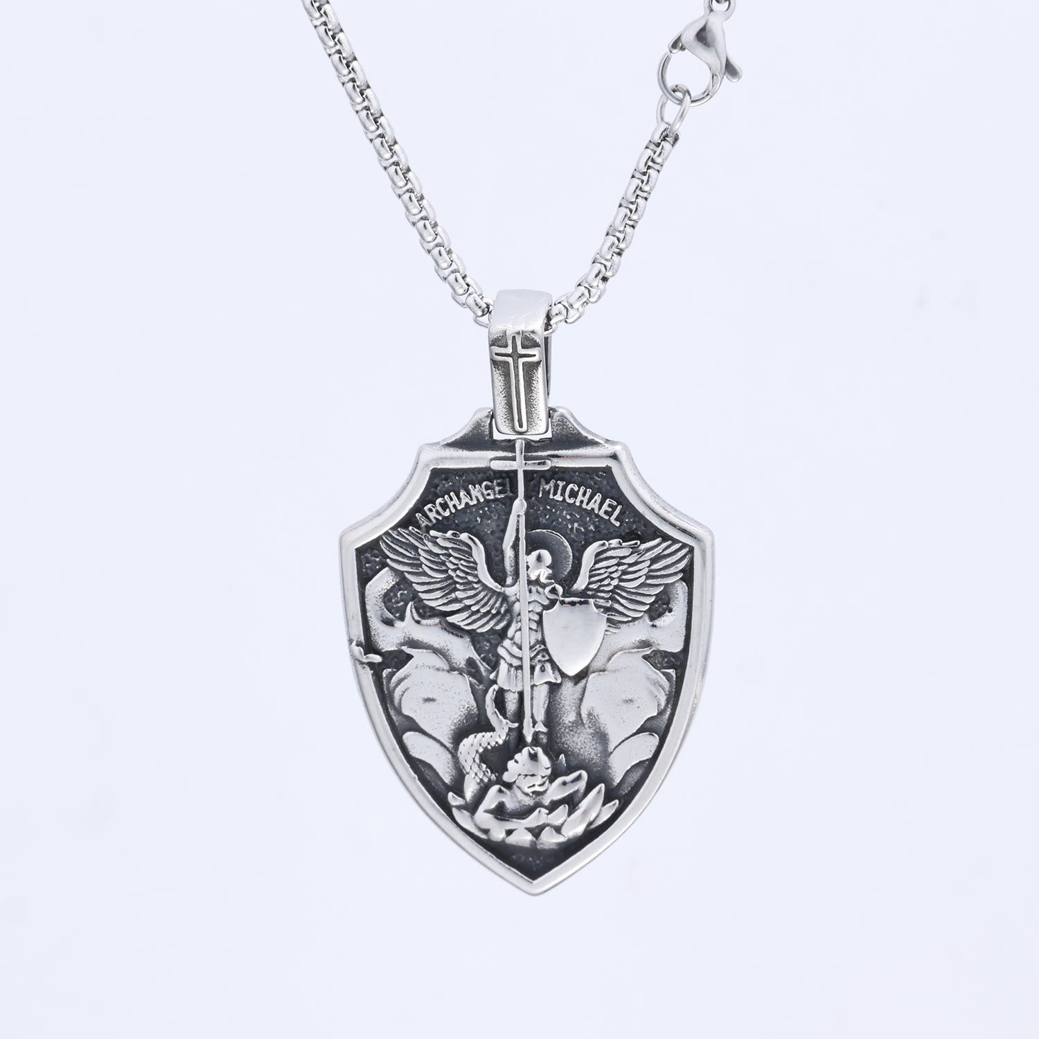 Con immagini dettagliate dell'Arcangelo Michele su ogni scudo e opzioni multi-tono, la collana unisce un'arte meticolosa al profondo significato spirituale della tutela divina.