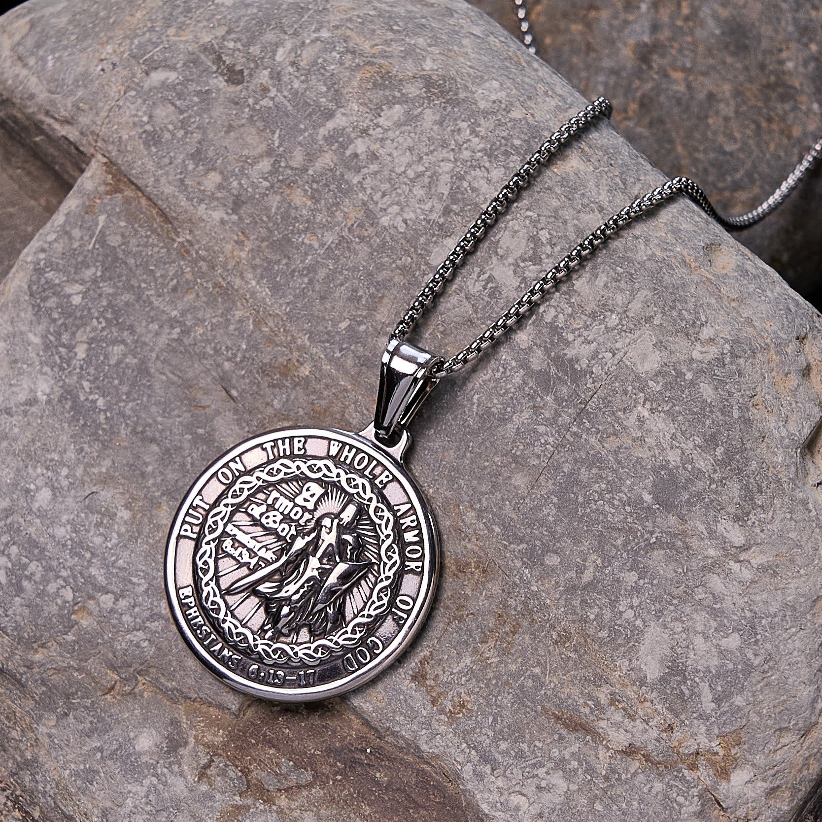 Caratterizzata da medaglioni dettagliati con la scritta "Completa l'armatura di Dio" e motivi guerrieri, questa collana irradia protezione spirituale e uno stile senza tempo, invitando a riflettere sulla difesa divina nella vita di tutti i giorni. - Artigianato durevole, simbolismo duraturo