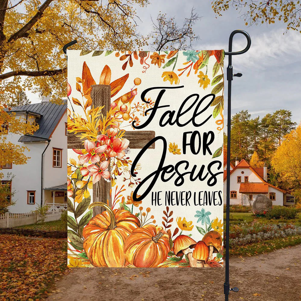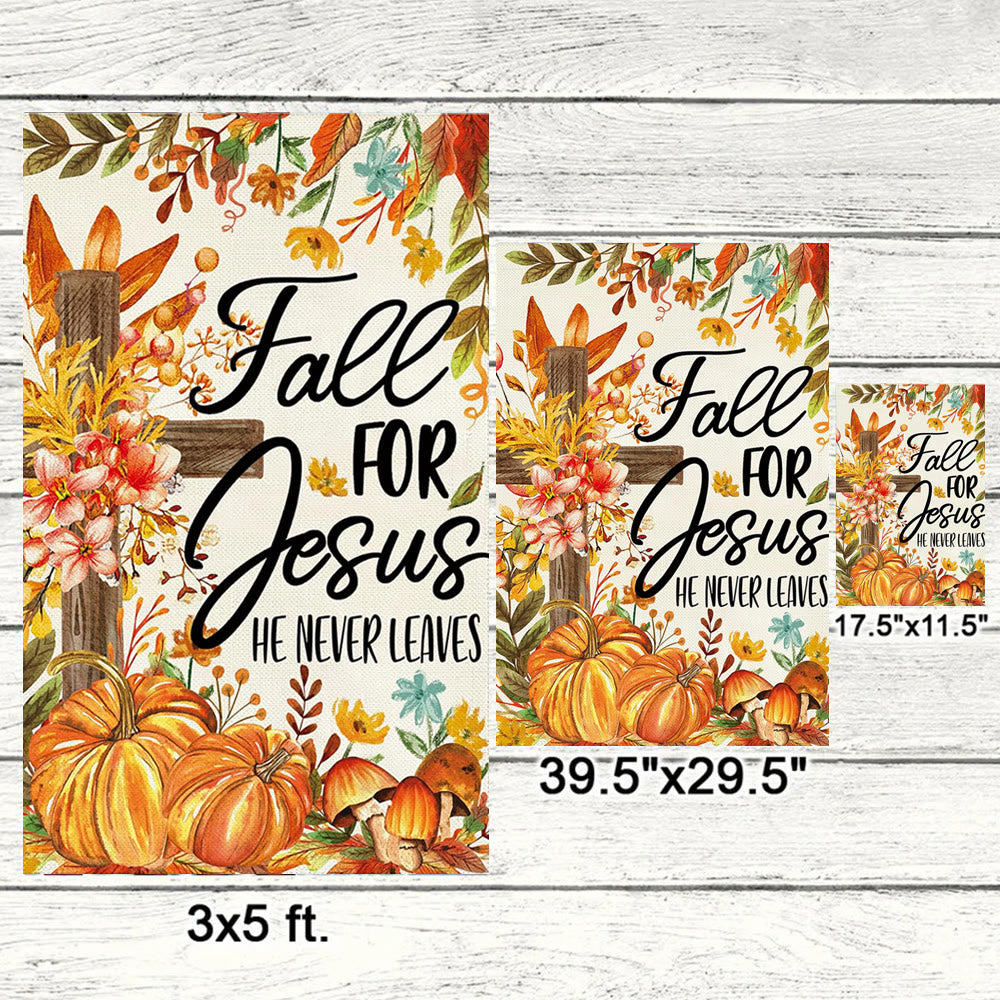 Celebra la bellezza dell'autunno e la fermezza della fede con questa bandiera da giardino dal design squisito, che presenta la frase edificante "Innamorati di Gesù, non ti abbandona mai", abbinata a caldi motivi autunnali come zucche, vibranti foglie autunnali, cardinali rossi e una croce di legno. - Creati per ispirare e per dare fascino alla stagione