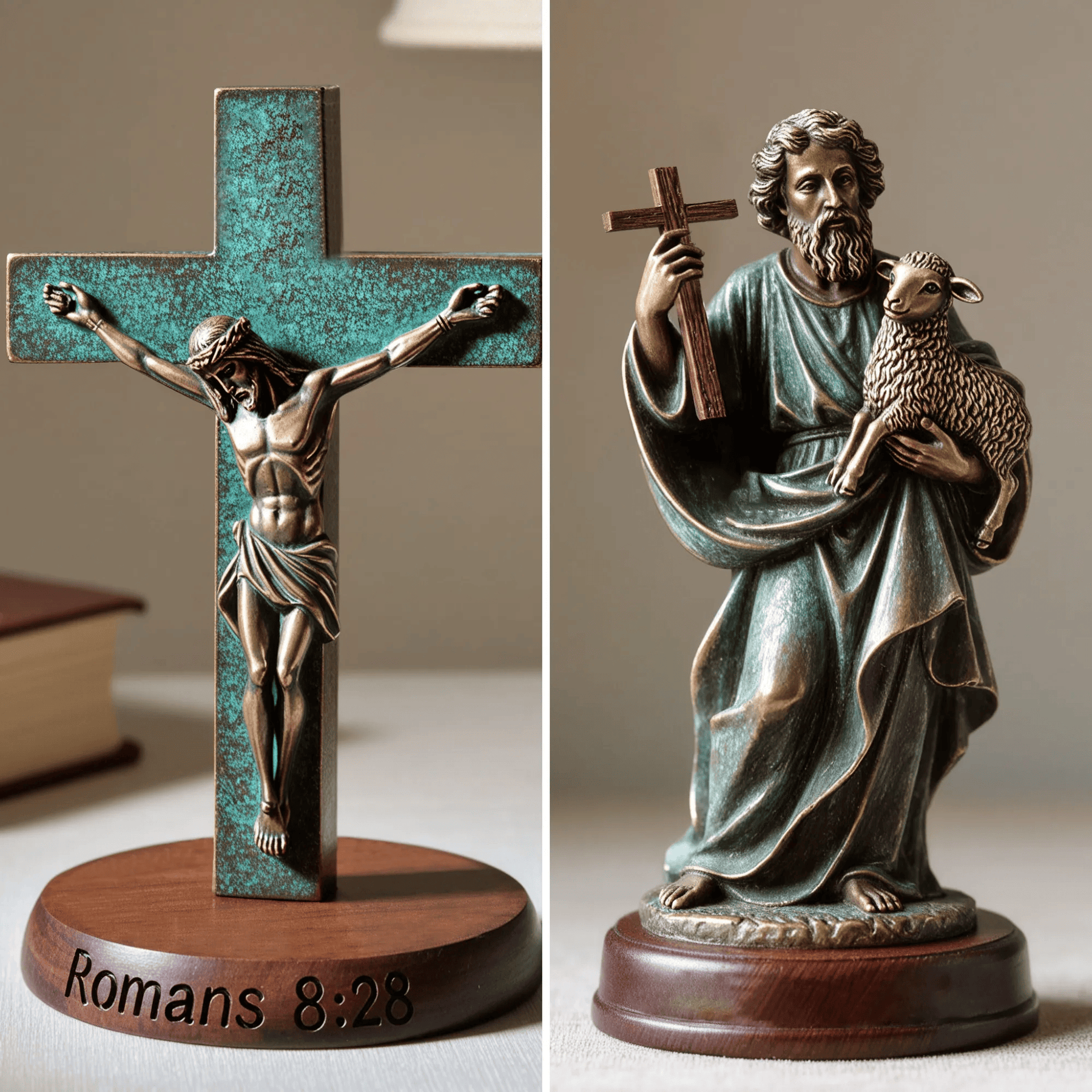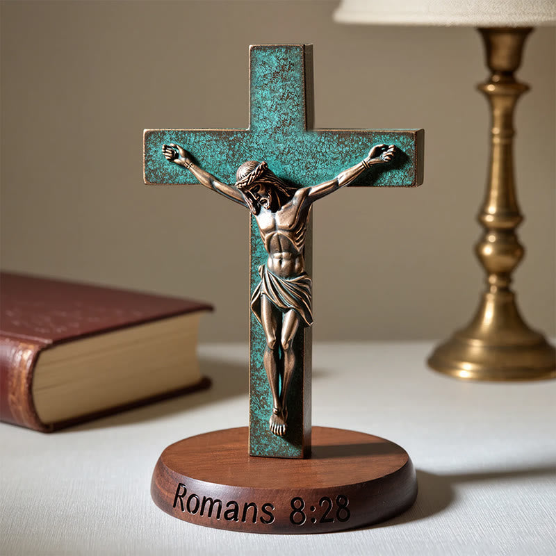 Crocifisso di Gesù in resina verderame su base in legno: ornamento da tavolo Romani 8:28